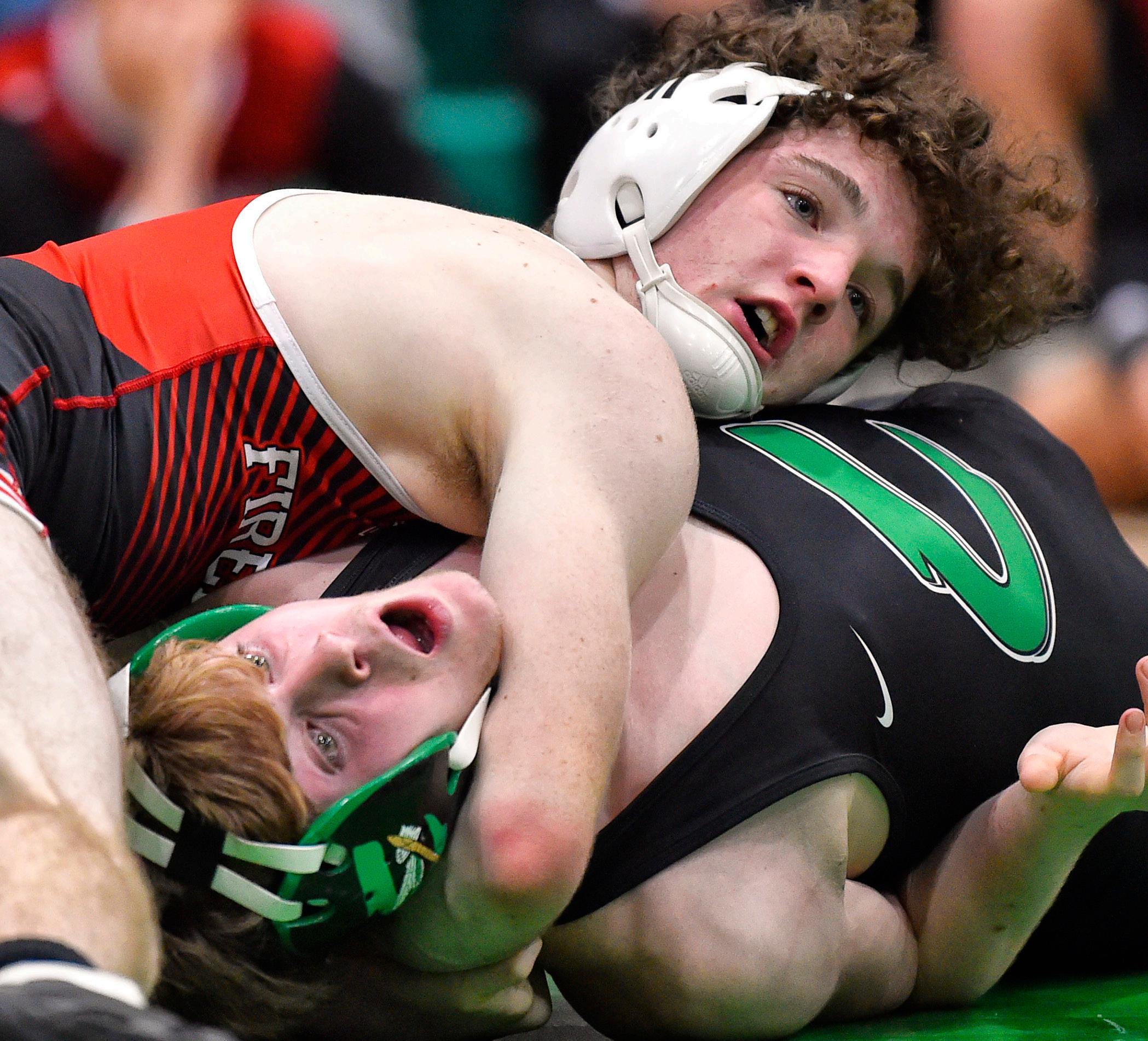BELOW LEFT: Firelands' Waylon McCutcheon puts Columbia's Ethan Valentine in a tough spot during a 126-pound class match.