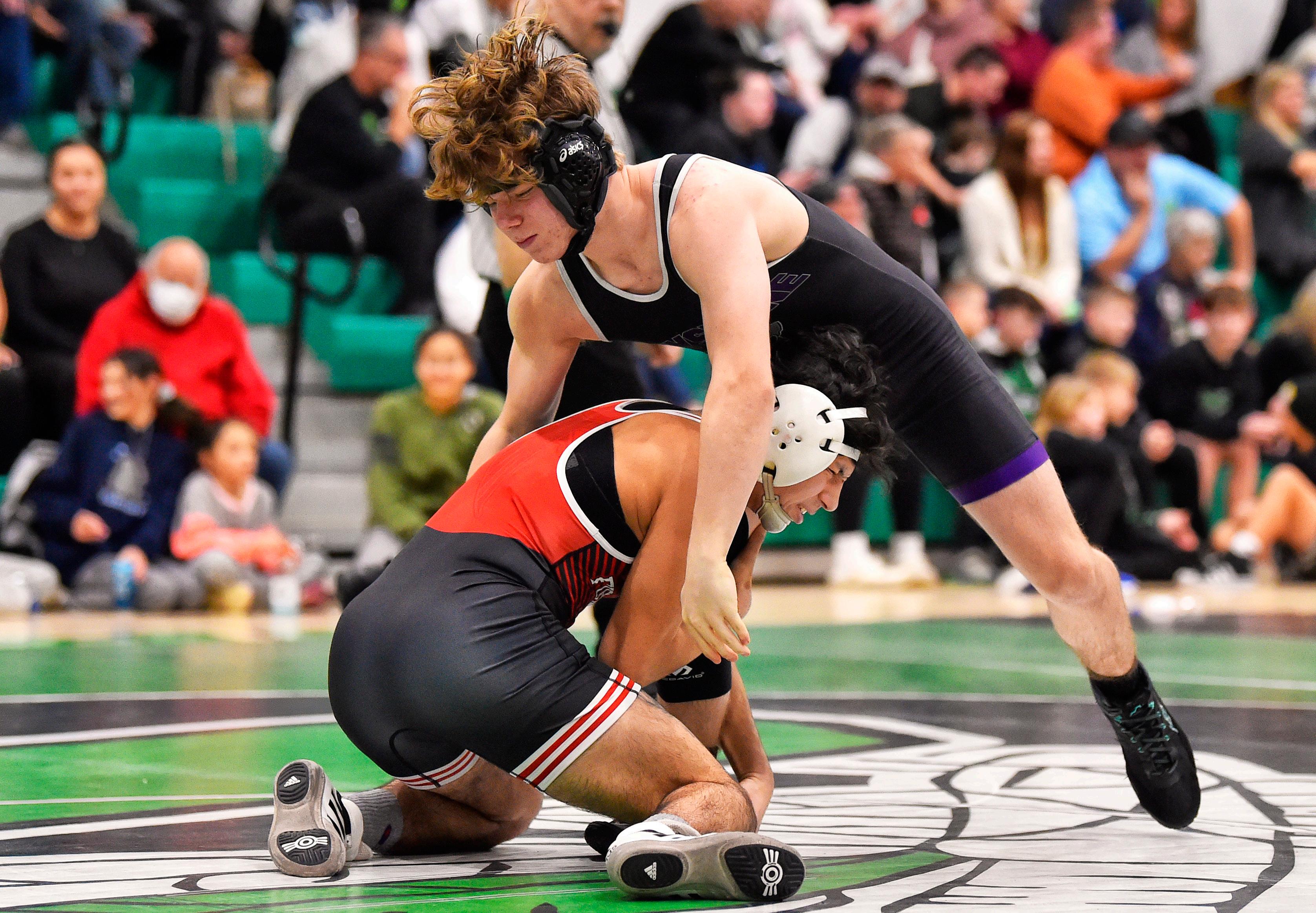BELOW RIGHT: Keystone's Sage O'Brien wrestles Oberlin's Isaiah Jackson in the 138-pound class.