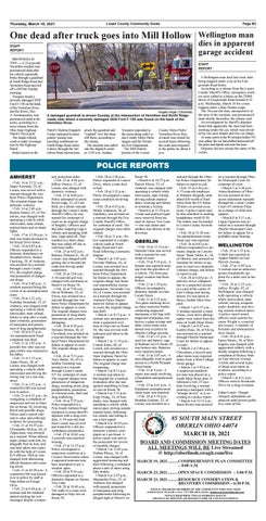 • Feb. 28 at 2:58 p.m.: Police responded to Lancer Drive, where a man died in bed. • Feb. 28 at 3:12 p.m.: Police investigated a suspicious condition involving mail. • Feb. 28 at 8:55 p.m.: Mindy Anderson, 34, of Sandusky, was arrested on a warrant through the Erie County Sheriff's Office for contempt of court. The original charges were theftrelated. • Feb. 28 at 11 p.m.: Police responded to a singlevehicle crash at North Ridge Road and Linn Road following a domestic dispute. • March 1 at 3:45 a.m.: Devonte Watkins, 26, of Lorain, was arrested on a warrant through the Amherst Police Department for failure to appear; the original charge was financial responsibility license suspension. Alexander Lee, 26, of Lorain, was arrested on a warrant through the Amherst Police Department for failure to appear in court; the original charge was theft. • March 1 at 9:13 p.m.: A woman was unresponsive from a suspected overdose at Days Inn on Route 58. She was revived with naloxone and taken to the hospital. • March 1 at 11:19 p.m.: Connie Jones, 48, of Lorain, was arrested on a warrant through the Ohio State Highway Patrol for failure to appear in court. The original charge was trespassing. • March 3 at 8:11 p.m.: A woman was taken to the hospital for a medical evaluation after she was spotted stumbling in front of cars on Route 58. • March 4 at 5:31 p.m.: Kipp Young, 33, of Sandusky, was charged with operating a vehicle while intoxicated, driving outside marked lanes, following too closely and failing to use a turn signal. • March 4 at 10:59 p.m.: Officers responded to a domestic violence complaint on Linn Road. A police report was sent to the prosecutor for review of possible charges. • March 5 at 11:02 p.m.: Nathan Blinco, 18, of Lorain, was charged with aggravated menacing and theft following a complaint about a sale of shoes using fake money. • March 6 at 2:47 p.m.: Marquesha Price, 25, of Amherst was charged with assault, possession of marijuana and drug paraphernalia following an alleged fight at Motel 6 on