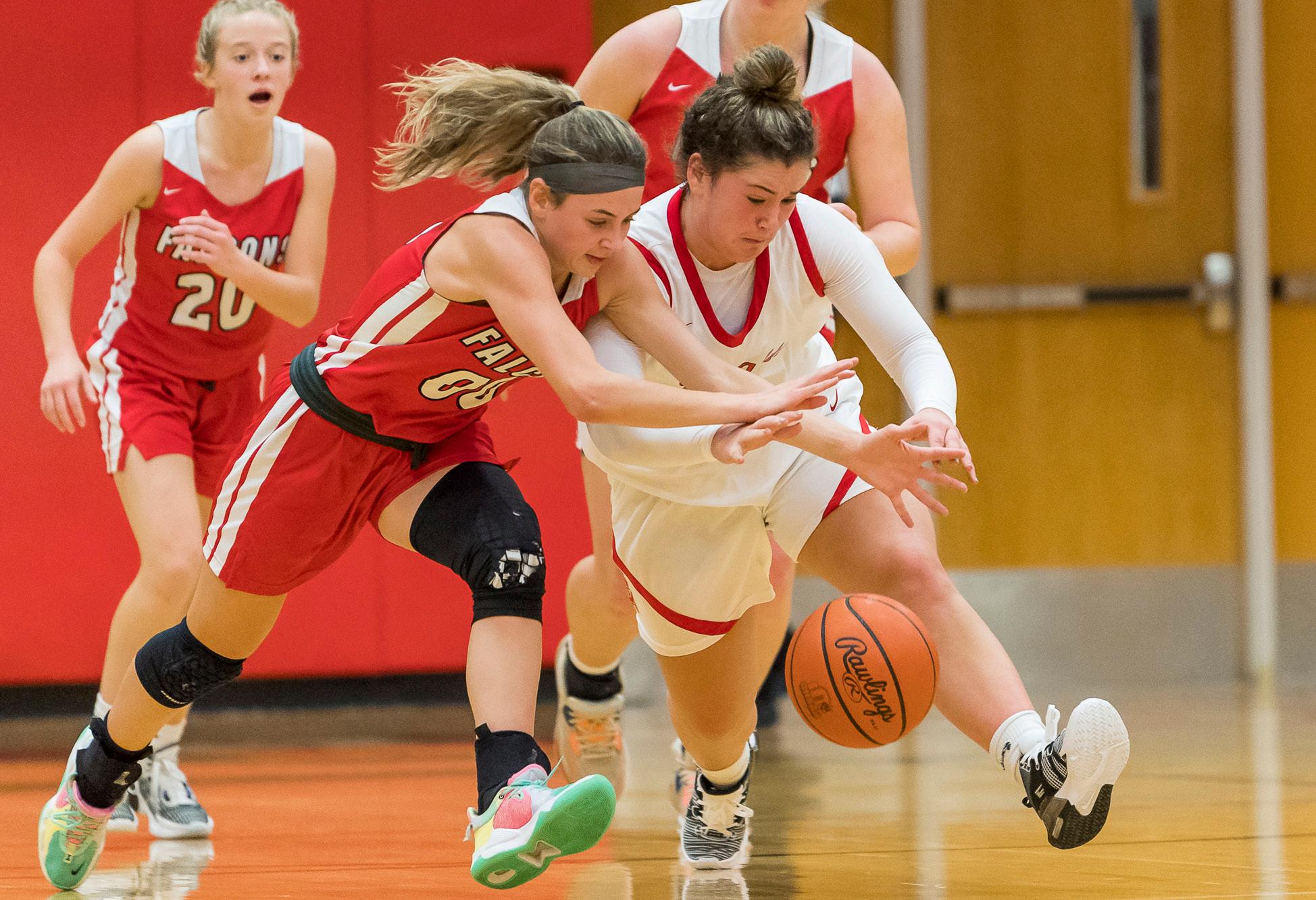Firelands fell 52-28 to the Red Wolves in the season opener at Cuyahoga Heights. The Falcons trailed 17-1 in the first quarter, and went into the locker room down 25-6 at the half. Wolves senior Tess Conroy led all scorers with 19 points. ABOVE: Firelands' Bella Simmons battles for the ball.