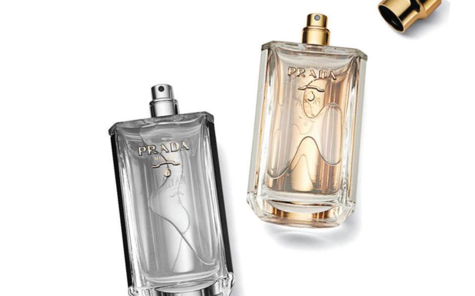 Os frascos dos perfumes de La Femme Prada e L’Homme Prada são complementares e representam as duas partes de um todo. O emblemático Saffiano Prada envolve a parte traseira arredondada do frasco nas cores branca, para a fragrância feminina, e preta, para a masculina. Já o logotipo da Maison aparece em ouro em La Femme e em prata em L’Homme. A escolha das cores também reflete as características, quente e fria/exótica e clássica dos perfumes.