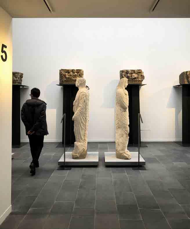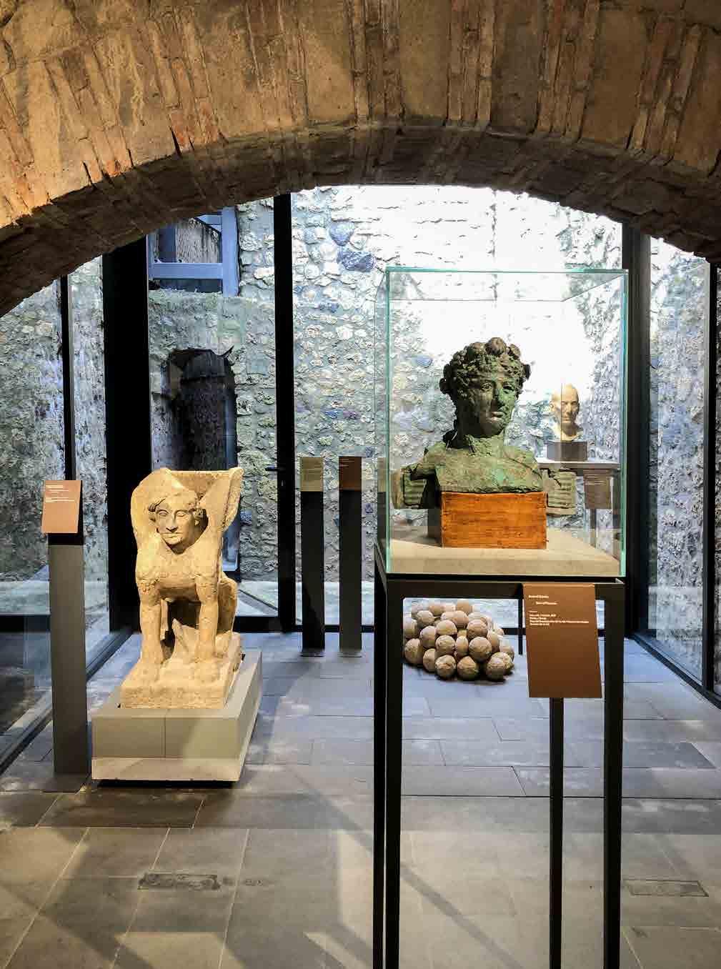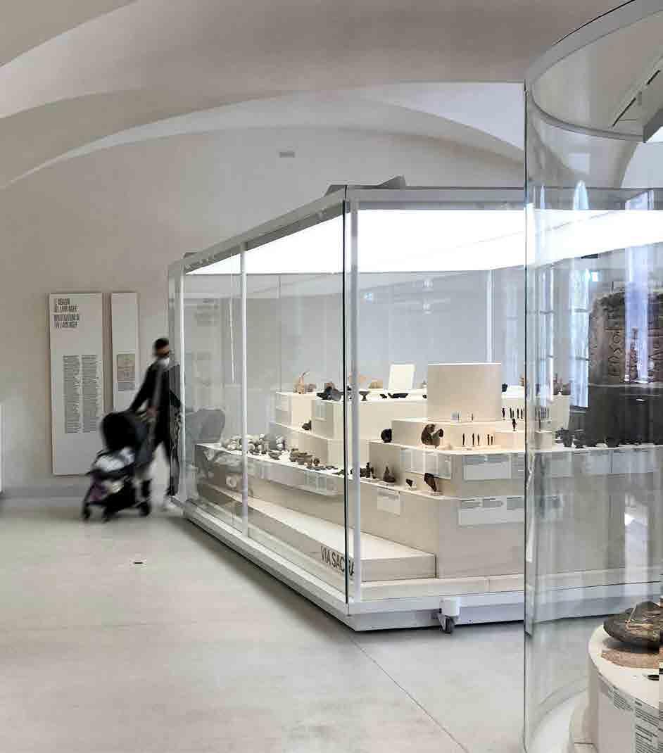 I reperti sono all’interno di grandi teche come in un labirinto luminoso che posa su un nuovo pavimento chiaro lapideo che integra quello antico romano.