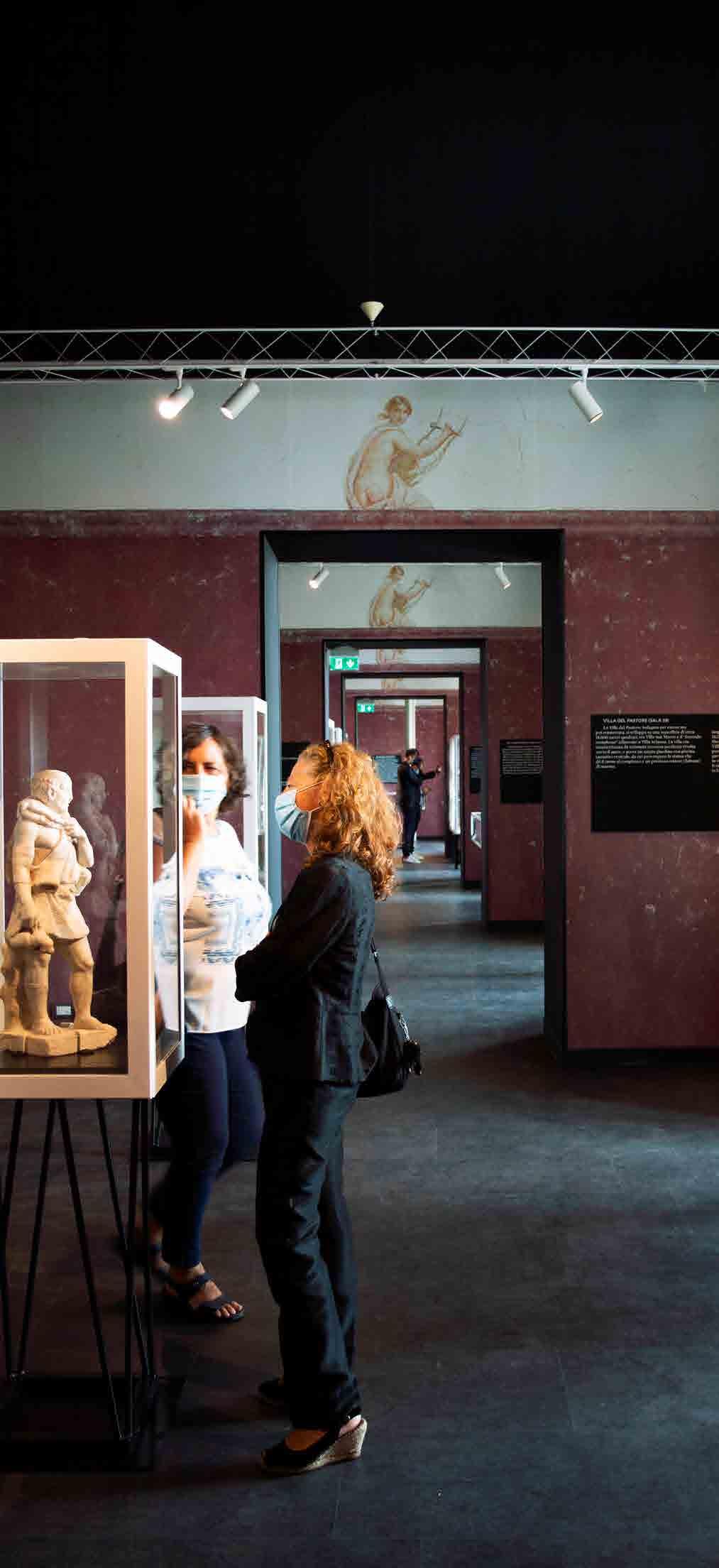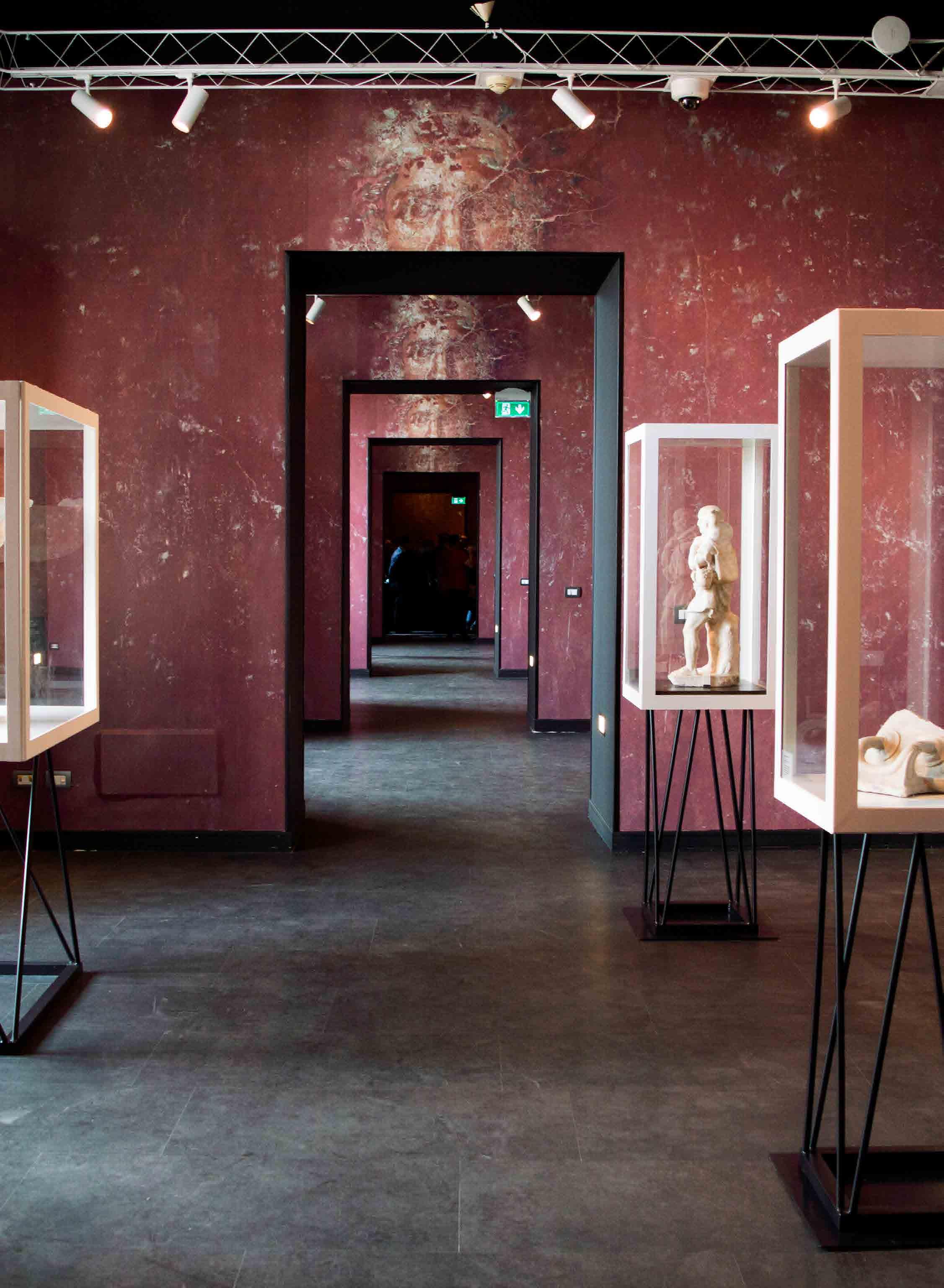 L’asse museale che ospita le prime dici sale è scandito ritmicamente da una sequenza di piani dentro l’iconografia, metre le altre 4 stanze e l’asse che portano all’uscita sono contraddistinte dai colori delle ville pompeiane