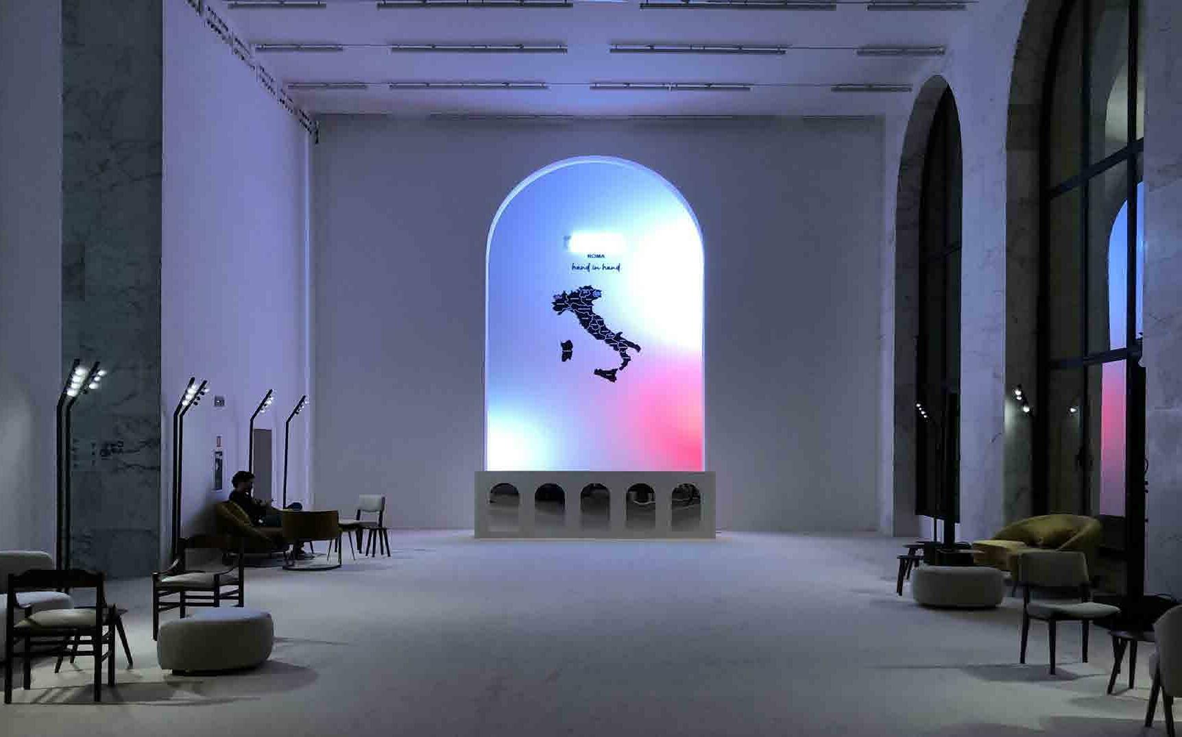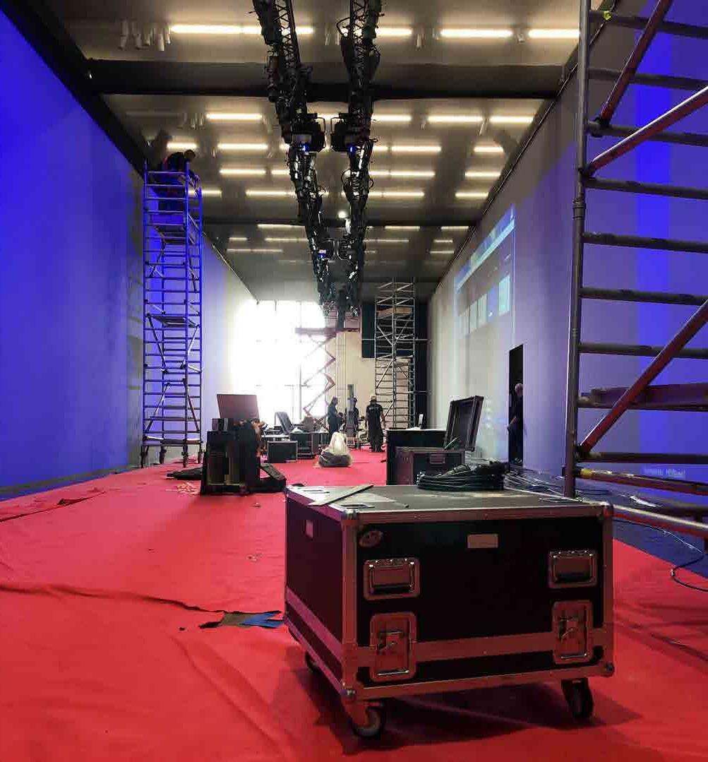 Il salone espositivo è stato tappato con pannelli autoportanti per non far entrare luce. La sala è rivestita nei lati corti di fogli specchiopiuma che danno l’impressione dello spazio infinito, mentre i lati lunghi con teli pvc per la proiezione del visual scenico.