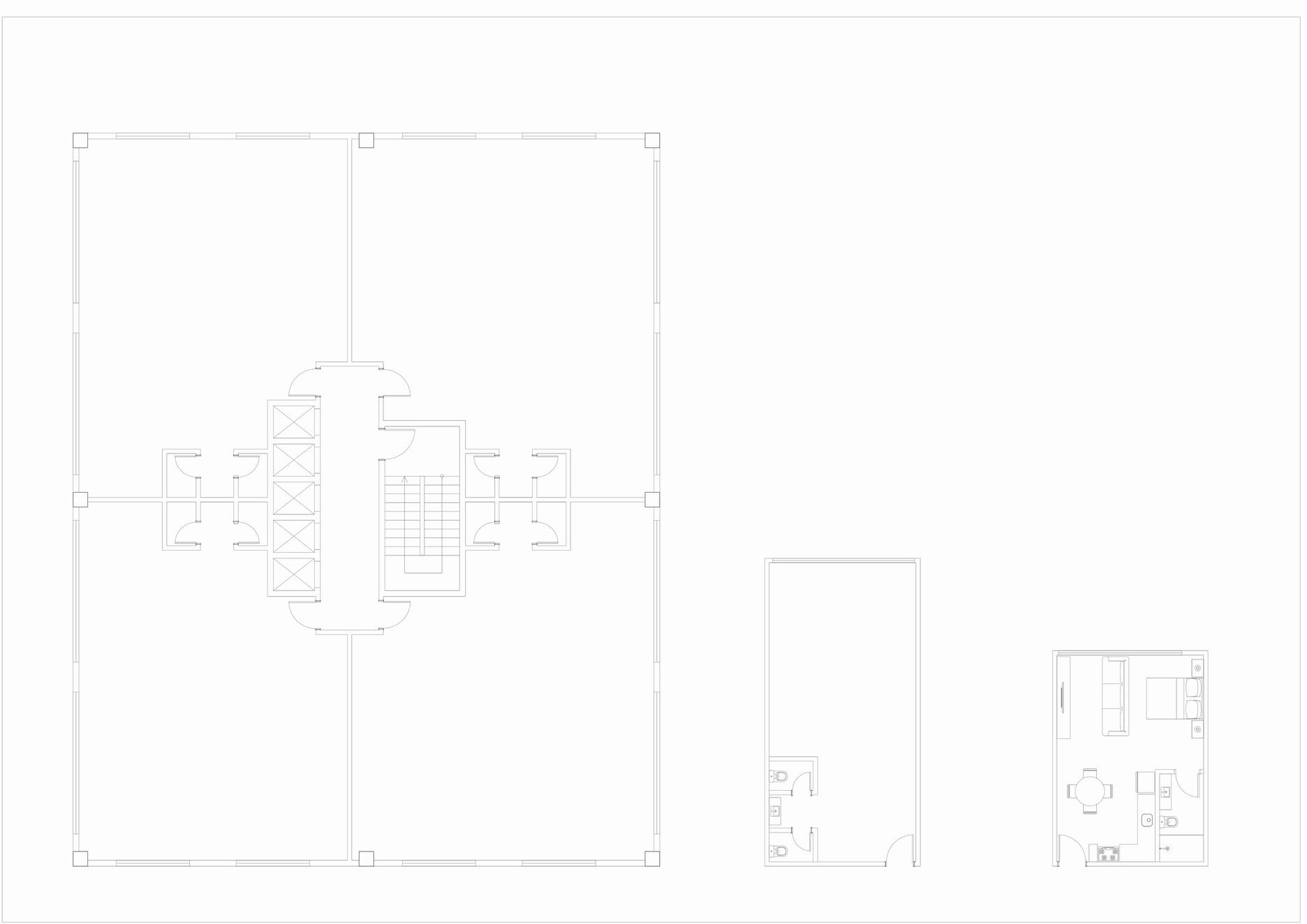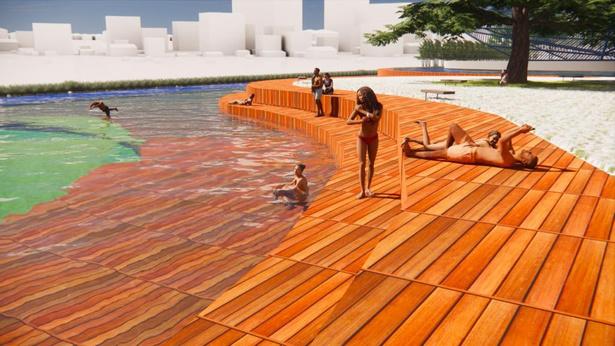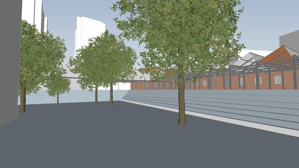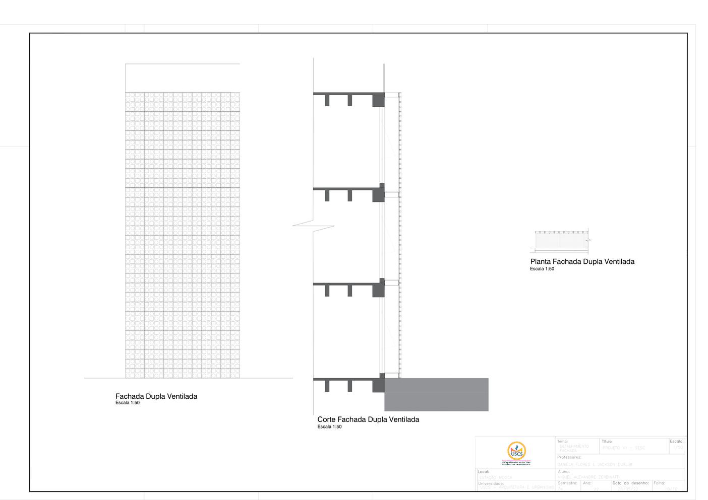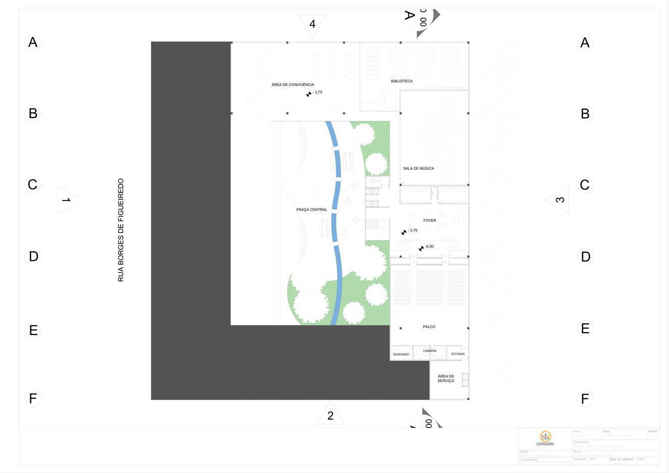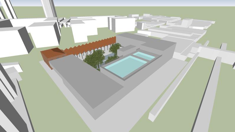 Interligando o externo ao interno, o projeto propõe uma praça central em dois níveis que conectam a rua ao pátio interno, que conecta ao subsolo, onde temos o teatro e a biblioteca e ao mesmo tempo a praça dá acesso aos pavimentos superiores, onde temos a comedoria, próxima a rua, as salas de ginástica multifuncional, as quadras e por fim, no último pavimento, a piscina, com vista para a praça central e para a cidade