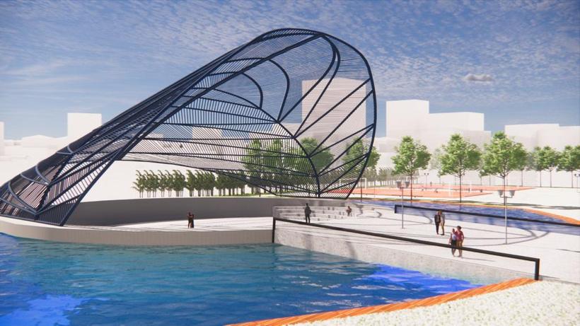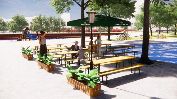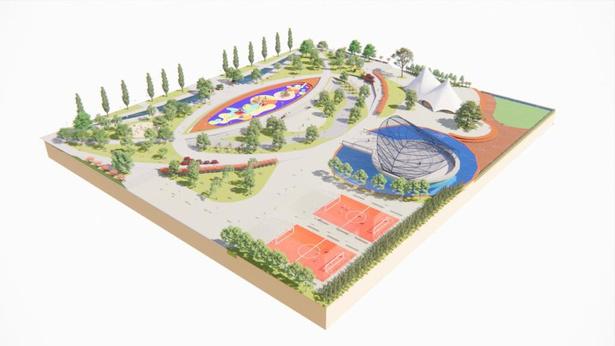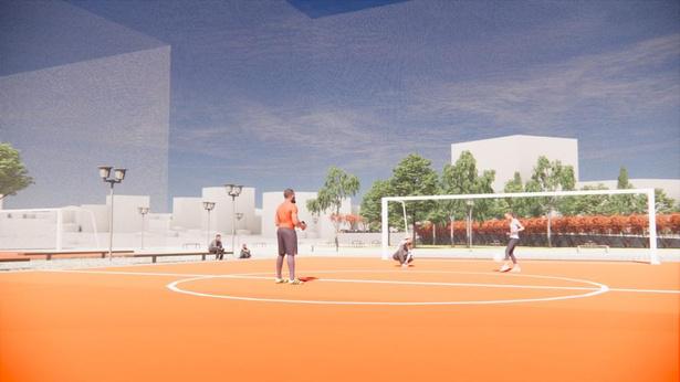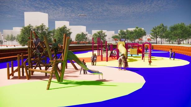 Criamos uma praça que permitisse o uso de todas as faixas etárias. Possui espaço pet, área de brinquedos com piso adequado, quadras poliesportivas, anfiteatro para eventos socioculturais, amplamente divididos pela área total da praça
