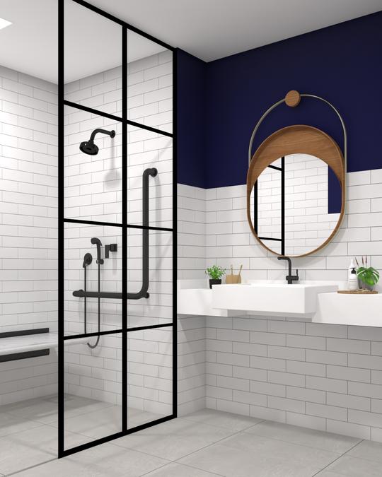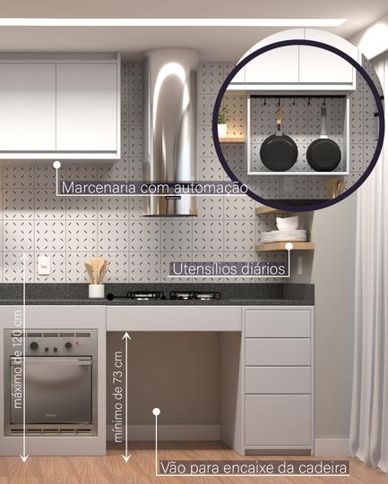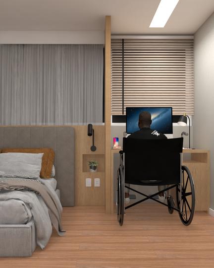 A proposta do projeto era a adaptação de um apartamento para que se tornasse acessível à usuários de cadeiras de rodas, assim propomos mobiliários reguláveis, bancadas com circulação livre