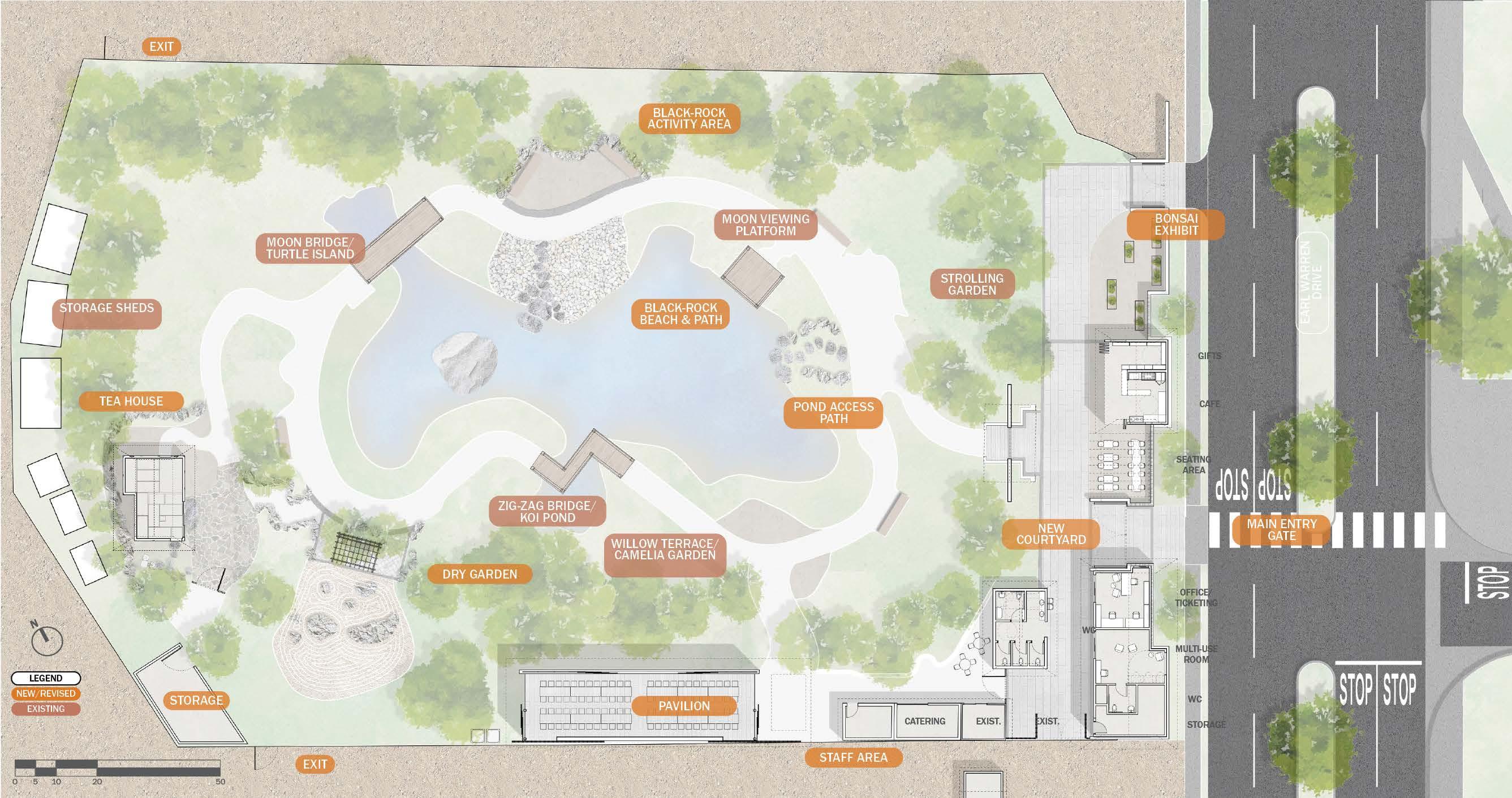 The main spaces developed were the Tea House, the Courtyard, the Pavilion, the Dry Garden, the Black Rock Beach Activity Area. The new project removes the existing Tea House that falls short in meeting the future needs of the Garden and provides the opportunity to construct a whole new one with traditional spaces and amenities that are typical of a Japanese Tea House. The Courtyard introduces a new program with a multipurpose room, cafe, office and ticketing, gift shop and a Bonsai Exhibit area. The Pavilion is envisioned as a highly flexible space used for general events. The Dry Garden provides shade and comfortable seating for a great viewing experience. The Black Rock Beach area is extended to promote small group activities.