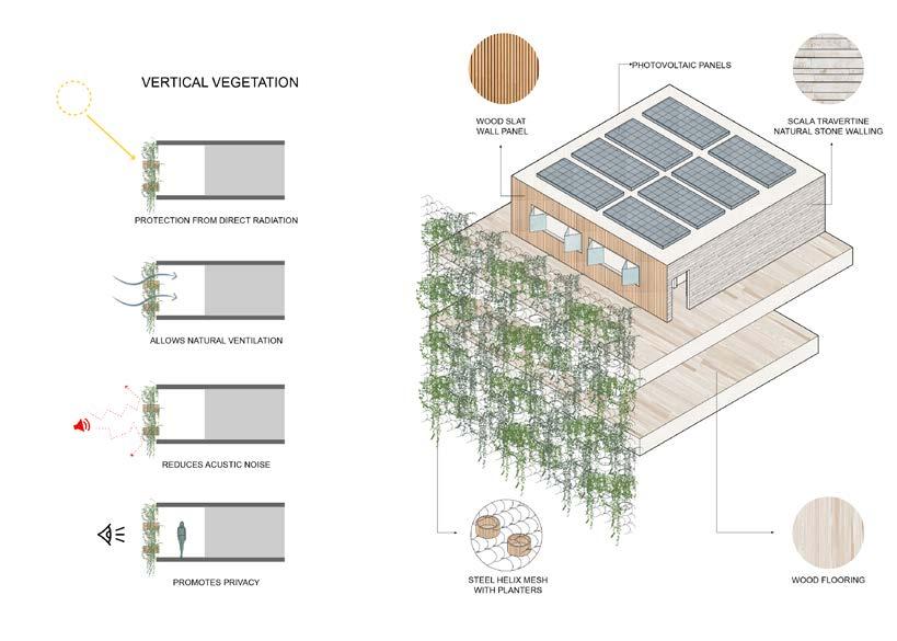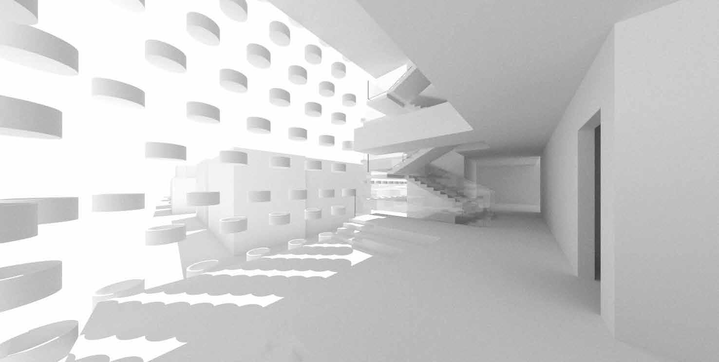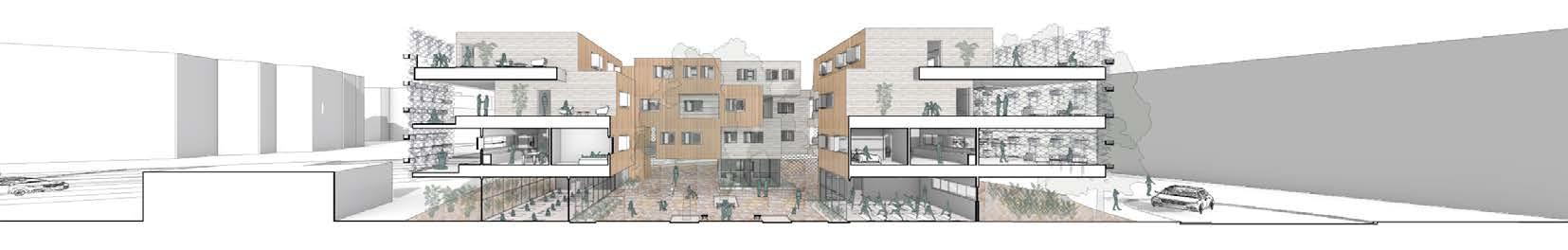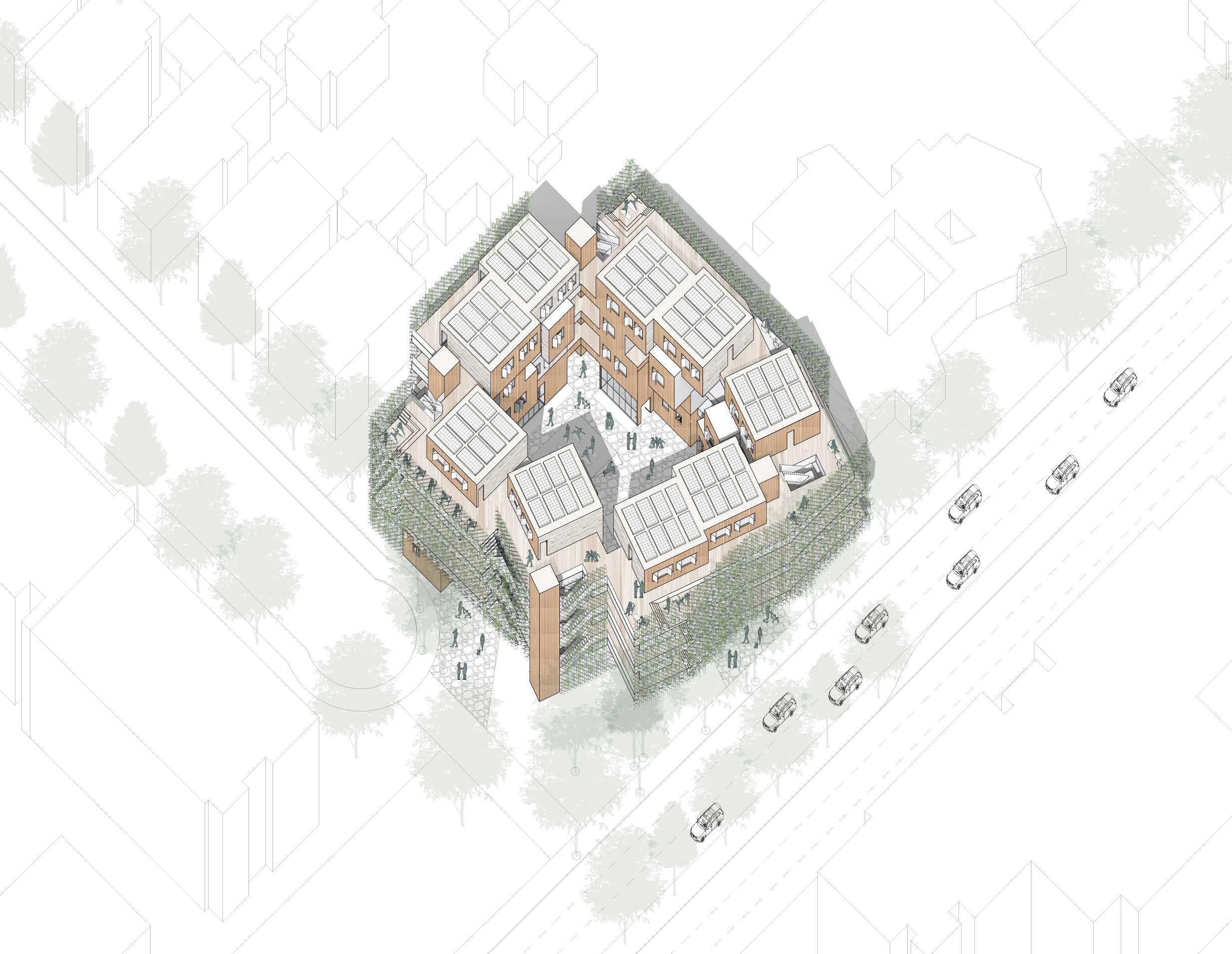 Due to the lack of establishments that focus on mental and physical wellness in the area, the Holistic Wellness Co-Operative comes as a way to promote happiness and improve quality of life among the residents of the co-operative by introducing a program of yoga studios for all ages. With the idea of Promoting Engagement between the residents and turning away from a busy street such as Vermont Ave, the project has a central courtyard as the main gathering space. Some of the units on the East side of the building are angled in order to improve cross ventilation from SW winds. The Co-op program happens on the main floor and the residential units are located on the second to fourth floors. Other communal spaces on each floor are purposely designed for small groups or individual yoga practices, meditation, or lounging. In order to protect from direct sun radiation, reduce noise pollution and promote privacy, a helix mesh with planters embedded is strategically placed throughout the facade of the building.