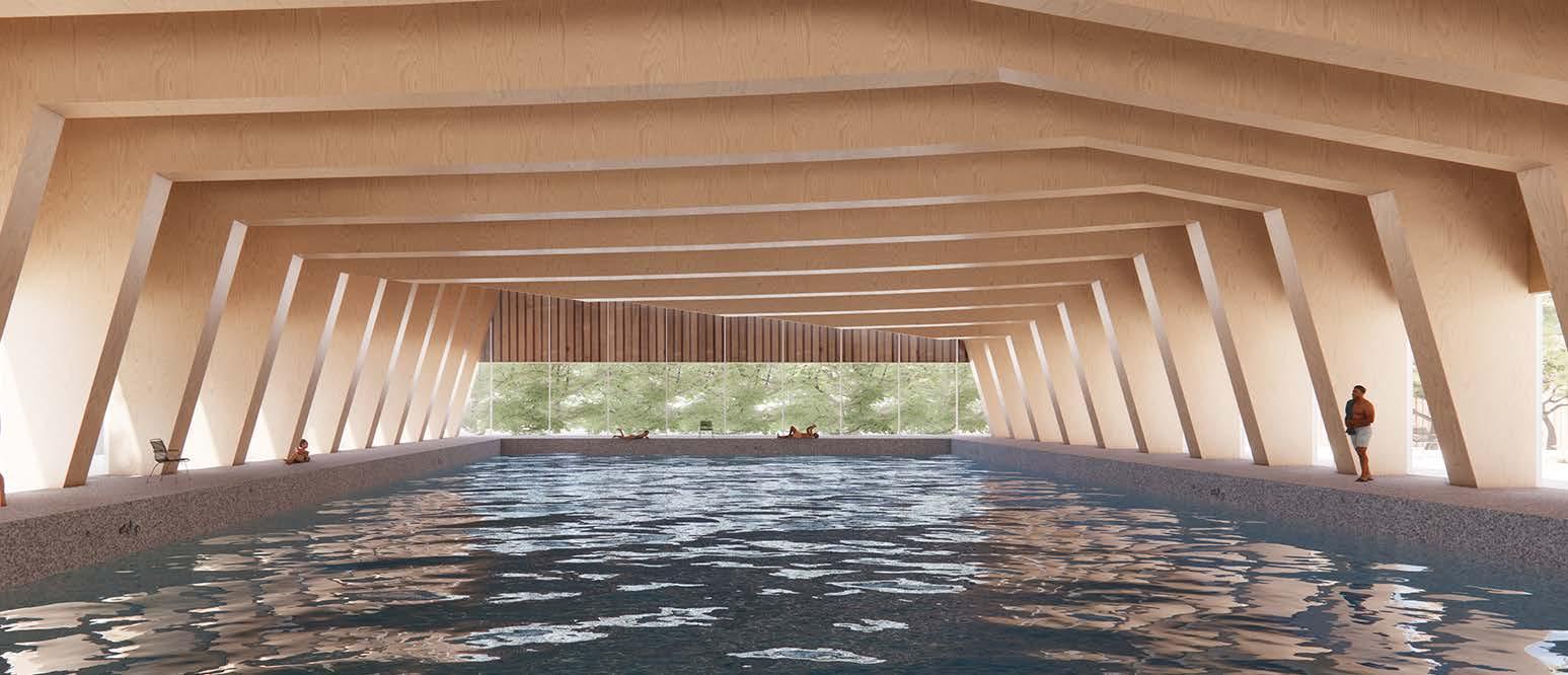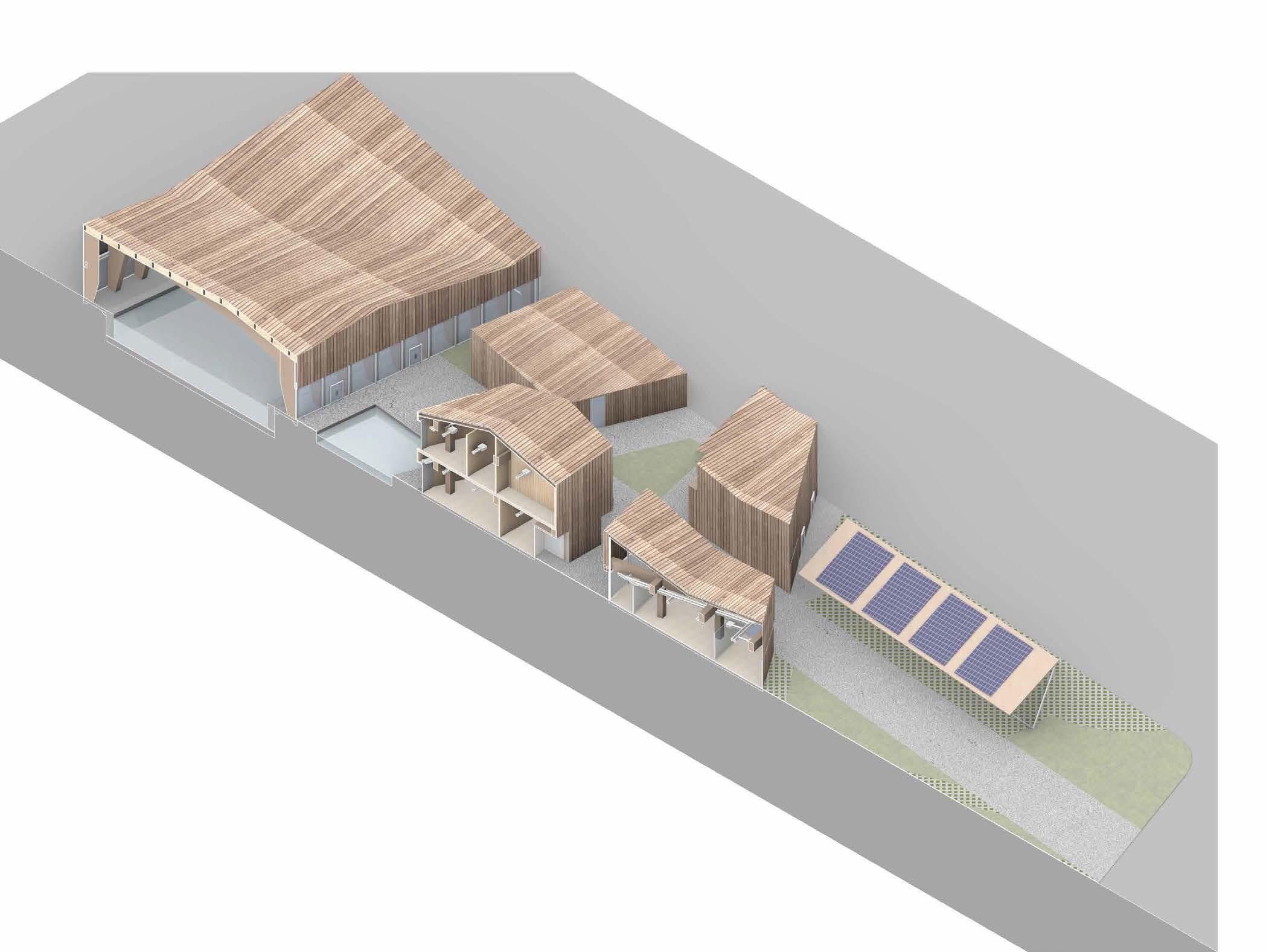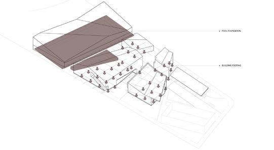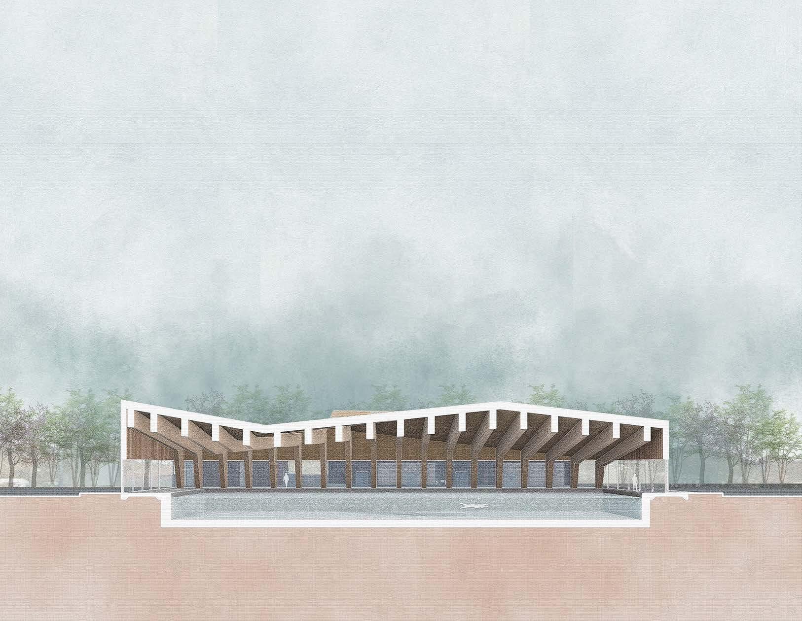 The Oakwood Recreation Center design has as a driving concept the lines from the wind rose diagram and they play a great role in the massing development. The winds coming from SW open access from 7th Ave towards California Ave. The massing is then divided into 4 major blocks: the indoor swimming pool, the public building, the mechanical and services, delivery and receive dock and the staff building. The wind rose lines also define the shape of the buildings and chunks are cutout from the roof to allow greater ventilation across the site. The main green spaces of the site are concentrated on the south facade and protects the facilities against sun radiation. The hardscape is mainly defined by the pedestrian paths to the buildings. Some angulations of the roof were purposely directed South. The angulation of the roof towards the South facade opens the possibility for the implementation of solar panels. This would allow for cuts in energy in the facilities. The site accesses are located on 7th Ave, California Ave and Oakwood Ave to allow easy entrance to the site. The main pedestrian paths run from California Ave towards the indoor pool on NW of the site and give access to all the buildings. The vertical circulation happens in the public building and gives access to the multipurpose room, gym, cafe, computer center and public restroom on the second floor.