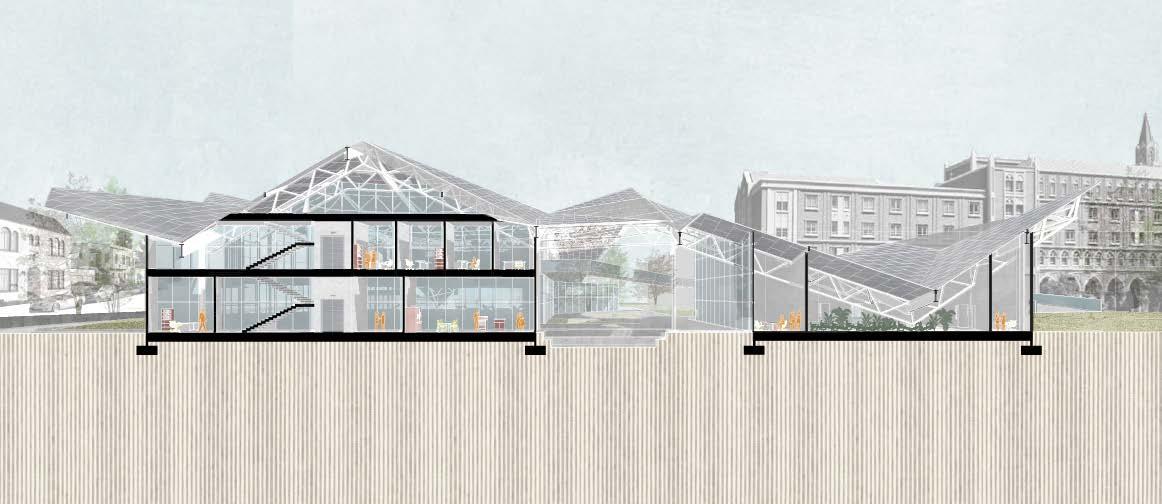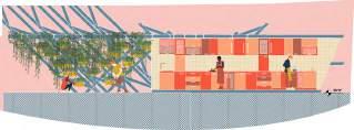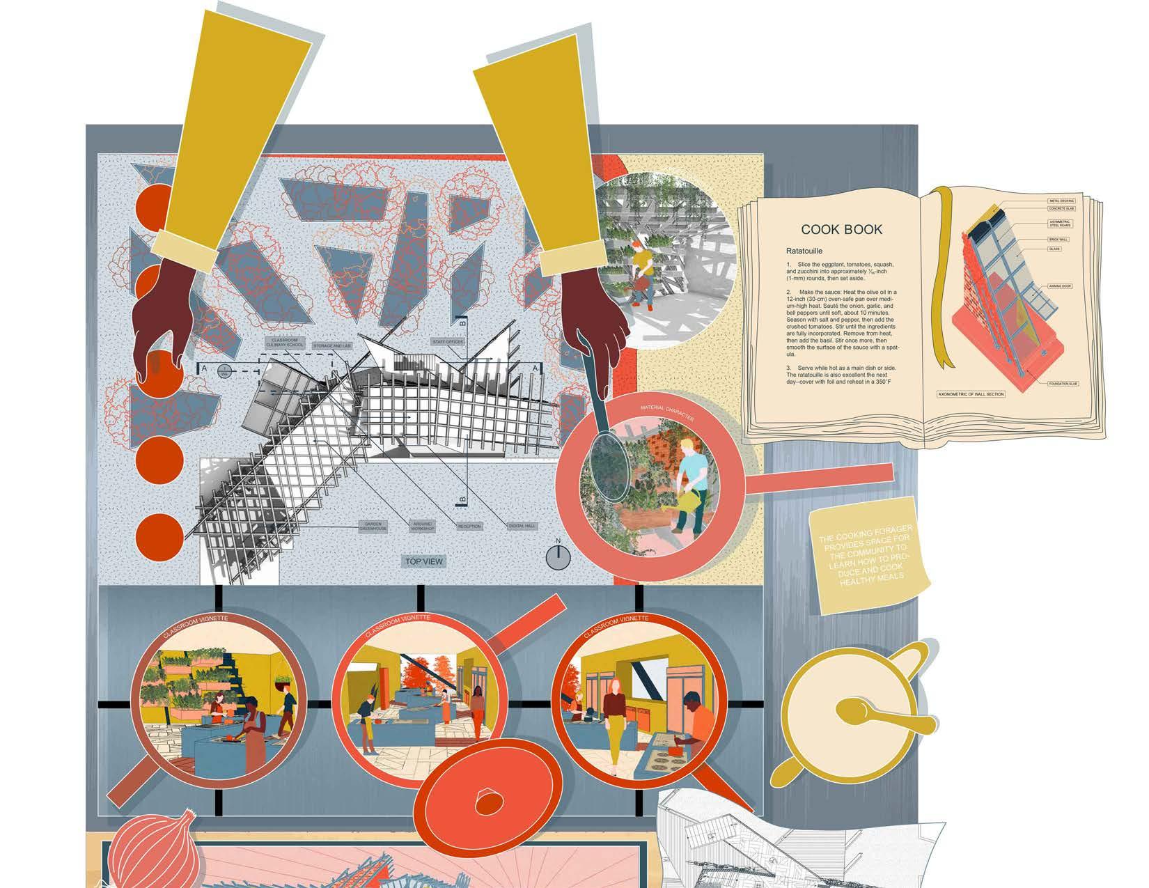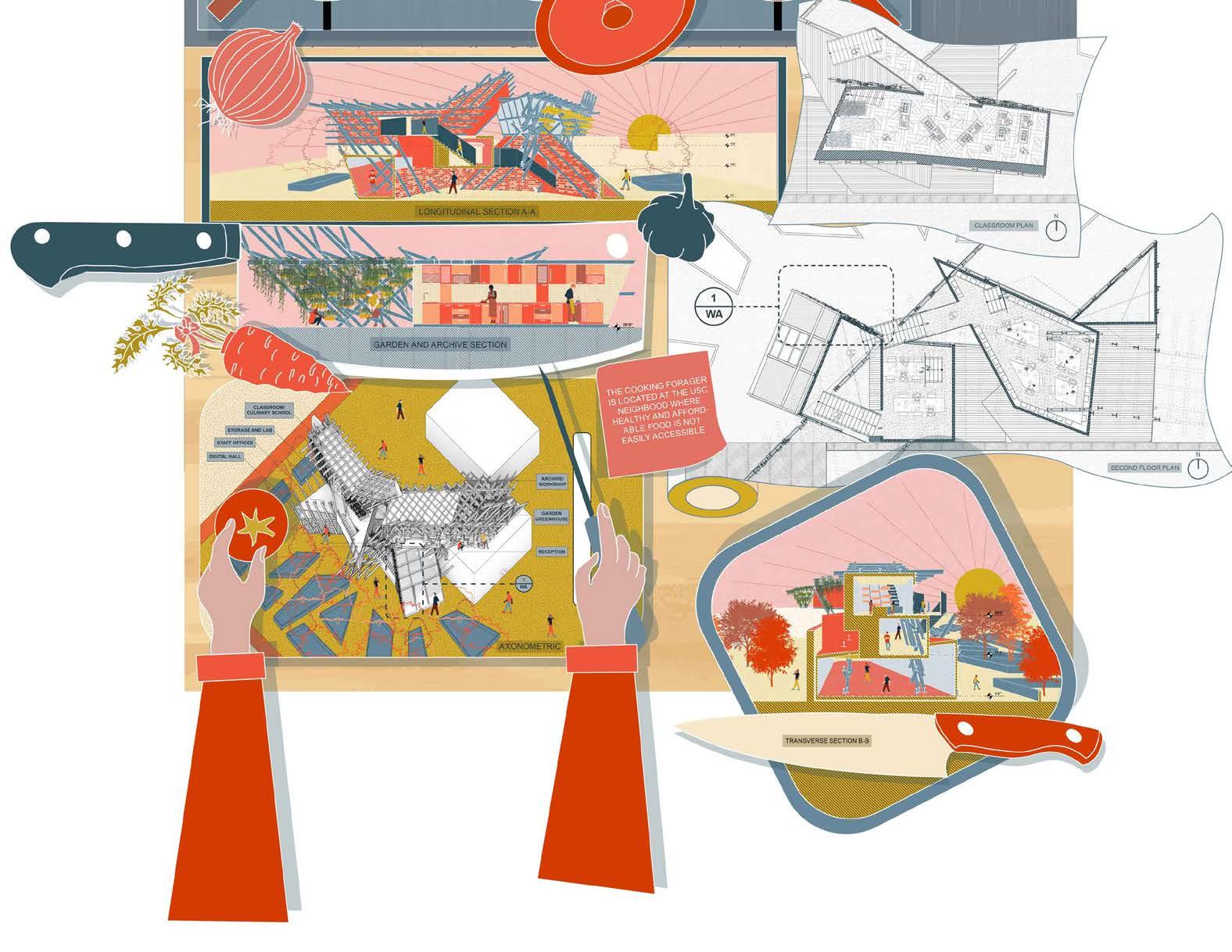 The Cooking Forager Culinary Art School provides a community space where locals learn how to produce and cook their own meals since the neighborhood of USC lacks healthy and affordable food resources. Classrooms were designed for local residents that would like to sign up for culinary classes and learn how to cook the food harvested in the community garden. The garden and the workshop spaces would be areas where locals can come any time of the day to collect their food and prepare it to take home, or even learn how to prepare the food correctly. The main purpose of The Cooking Forager is to be an open space for USC locals to have access to healthy food that would lead to a healthier lifestyle.