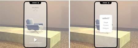 In the exhibition phase, we create a double way path that will display the real design objects. People will arrive to the exhibition, and will walk on one way through the path, being able to see just the pieces of furniture. Once they arrive at the end, they will come back to the beginning, but this time pointing the objects with their phone to reveal the Augmented Reality.