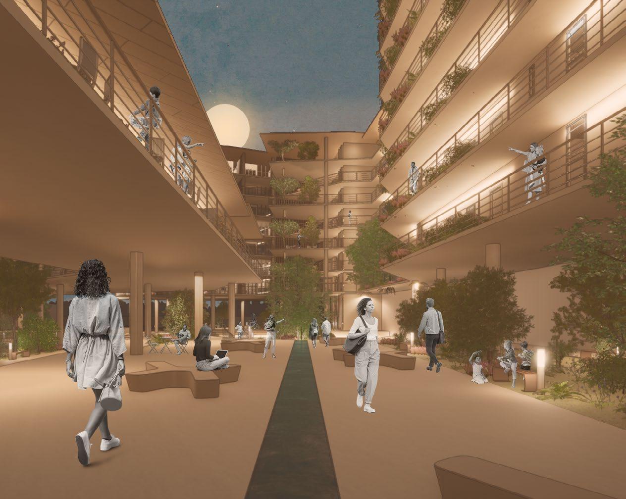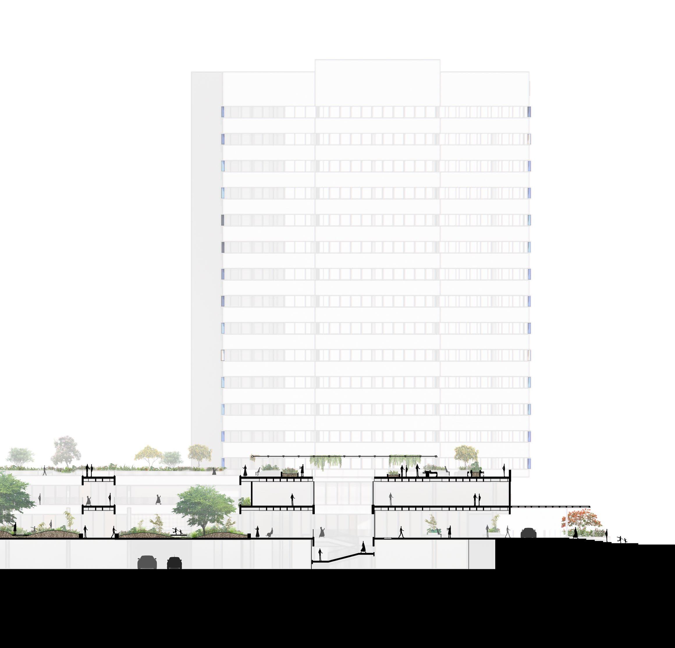 Su planta baja es una zona de convergencia totalmente abierta, protegida por losas sobre las cuales estarán las zonas residenciales y comerciales.