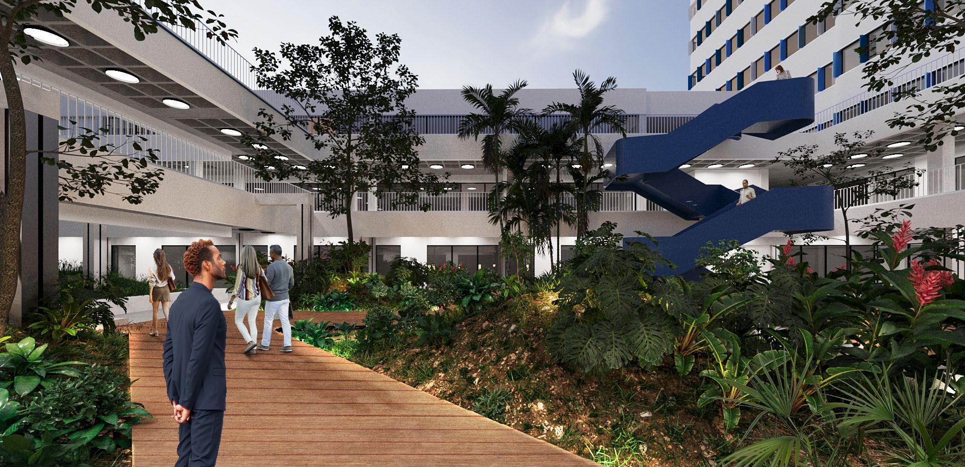 Los jardines se realizarán con especies nativas que requieren bajo mantenimiento. Se complementarán los jardines interiores con espacios para el descanso y se hará un jardín en el nivel 200 creando un espacio común.