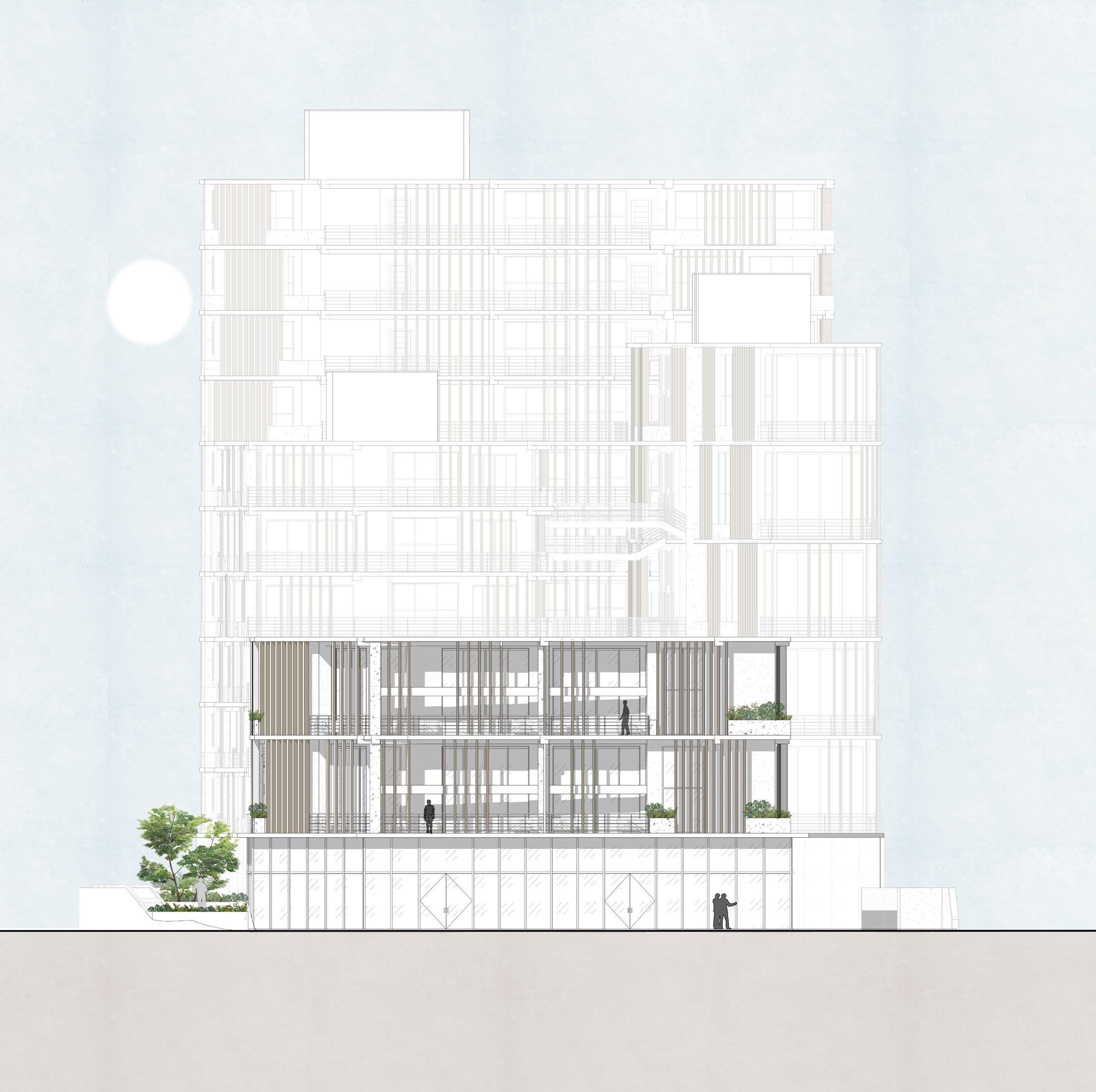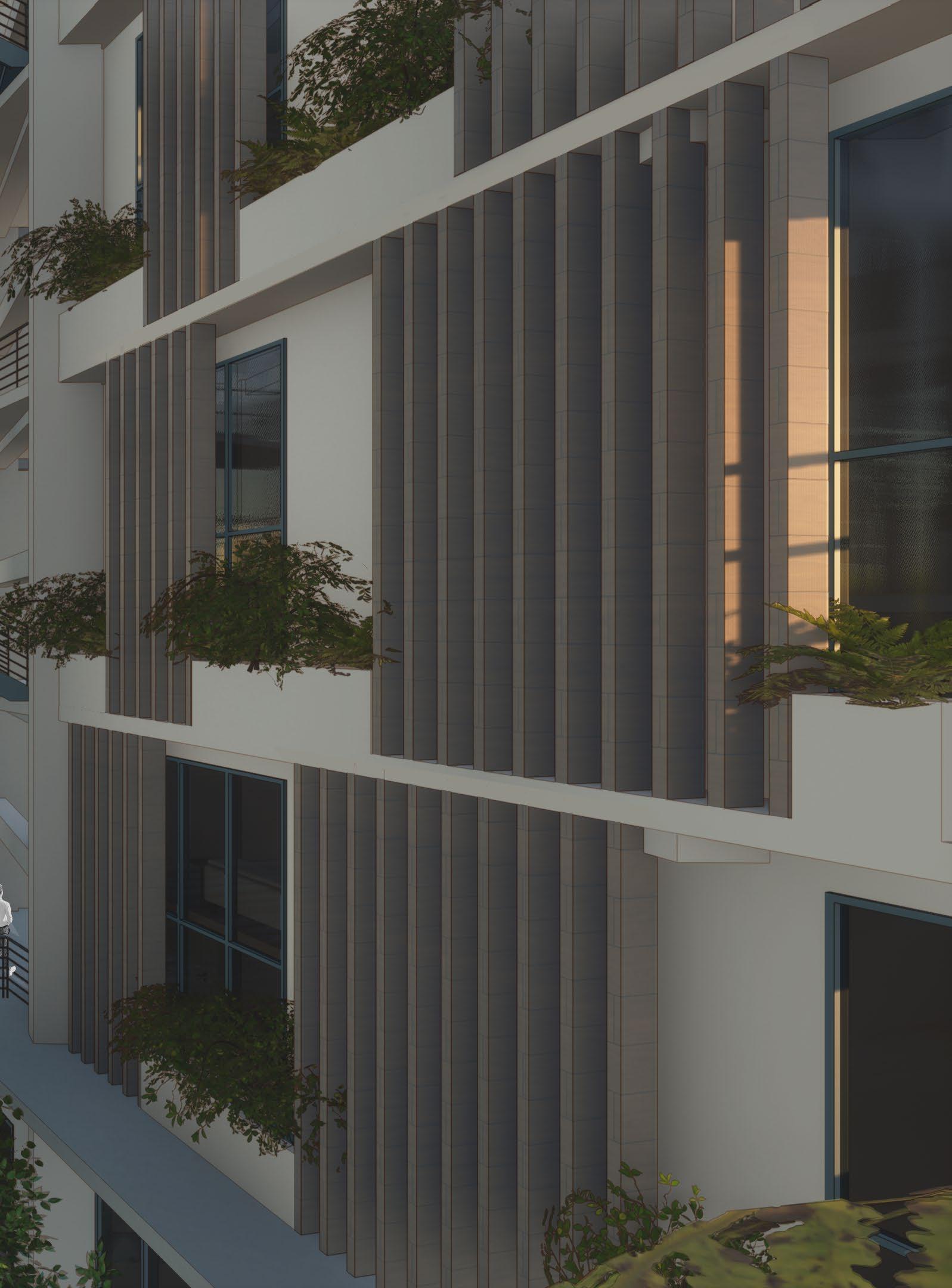 La fachada propuesta consta de láminas de madera contrachapada las cuales actúan como quiebrasoles, que junto a los jardines perimentrales, mantienen la ventilación fresca y que protegen directamente de los rayos del sol.