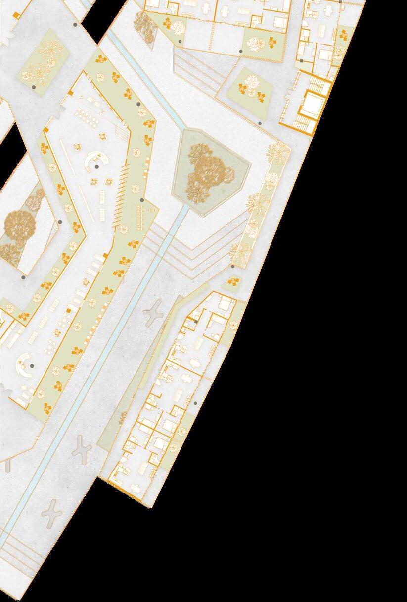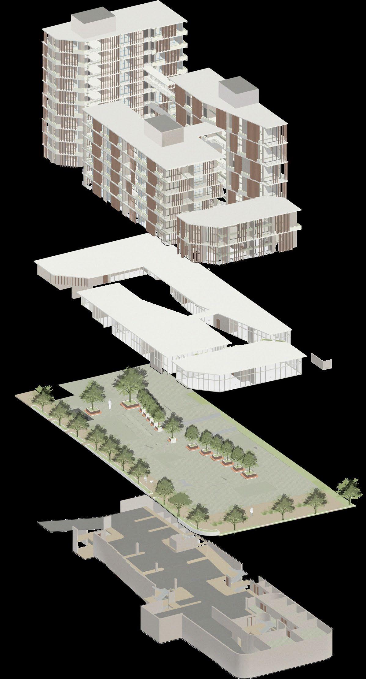 cuales recuprerarían sus zonas de trabajo ya que se incluye un área comercial dentro del proyecto. La composición del mismo nace desde la proyección de dos ejes principales guiados por las calles cercanas al terreno. Entre los límites del proyecto y los vecinos colindantes, obtenemos ejes secundarios los cuales nos permiten trabajar con una retícula propia de la zona.