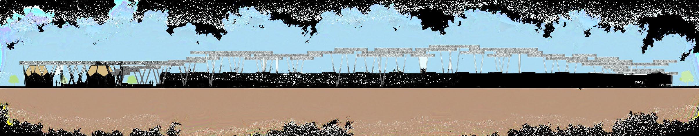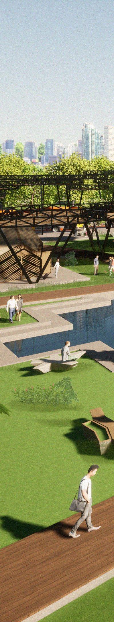 Para proteger al peatón del clima, diseñamos una serie de cubiertas sencillas pero funcionales, las cuales se unen con la vegetación propuesta creando ambientes únicos y cómodos a través de todo el recorrido hasta el punto de las terminales. Utilizamos materiales tales como la madera, el acero y láminas de acrílico transparente, para mantener un juego de sombras con la luz que se filtra entre las maderas.