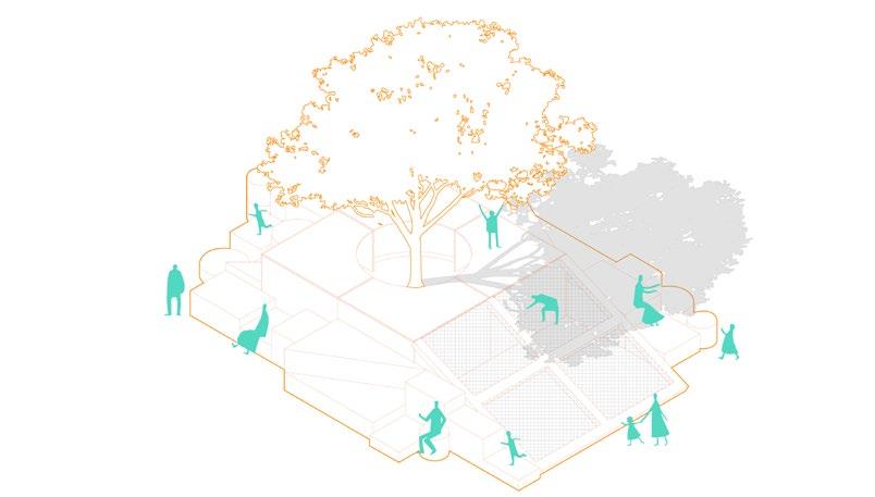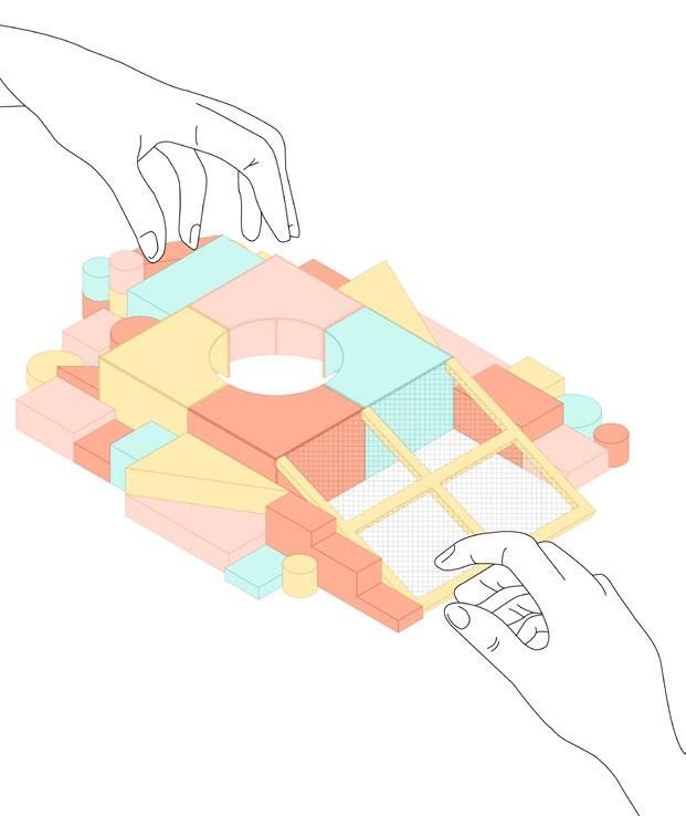 A partir de figuras sencillas y gentiles, apilamos estas formas icónicas de la filosofía de juego de Friedrich Froebel. Estas siluetas permiten crear un ambiente flexible e interactivo, que invite tanto a jóvenes como adultos a conectar, crear e interactuar con el espacio. Al mantener la mayoría de estos cuerpos ligeros y sencillos, logramos crear piezas móviles, las cuales pueden organizarse en diferentes configuraciones, obteniendo un sitio activo, dinámico y estimulante.