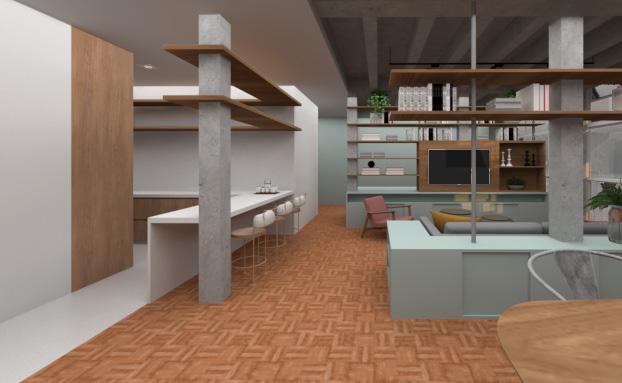 O layout proposto visa uma nova realidade pós pandemia. Por isso, ao entrar no apartamento, tanto pela entrada principal quanto pela de serviço localiza-se a área de higienização das mãos e de compras, onde é possível também guardar sapatos e roupas vindos da rua.