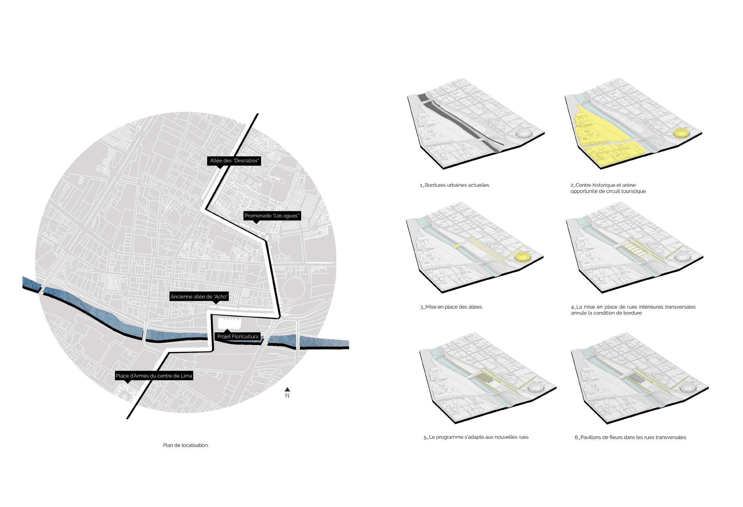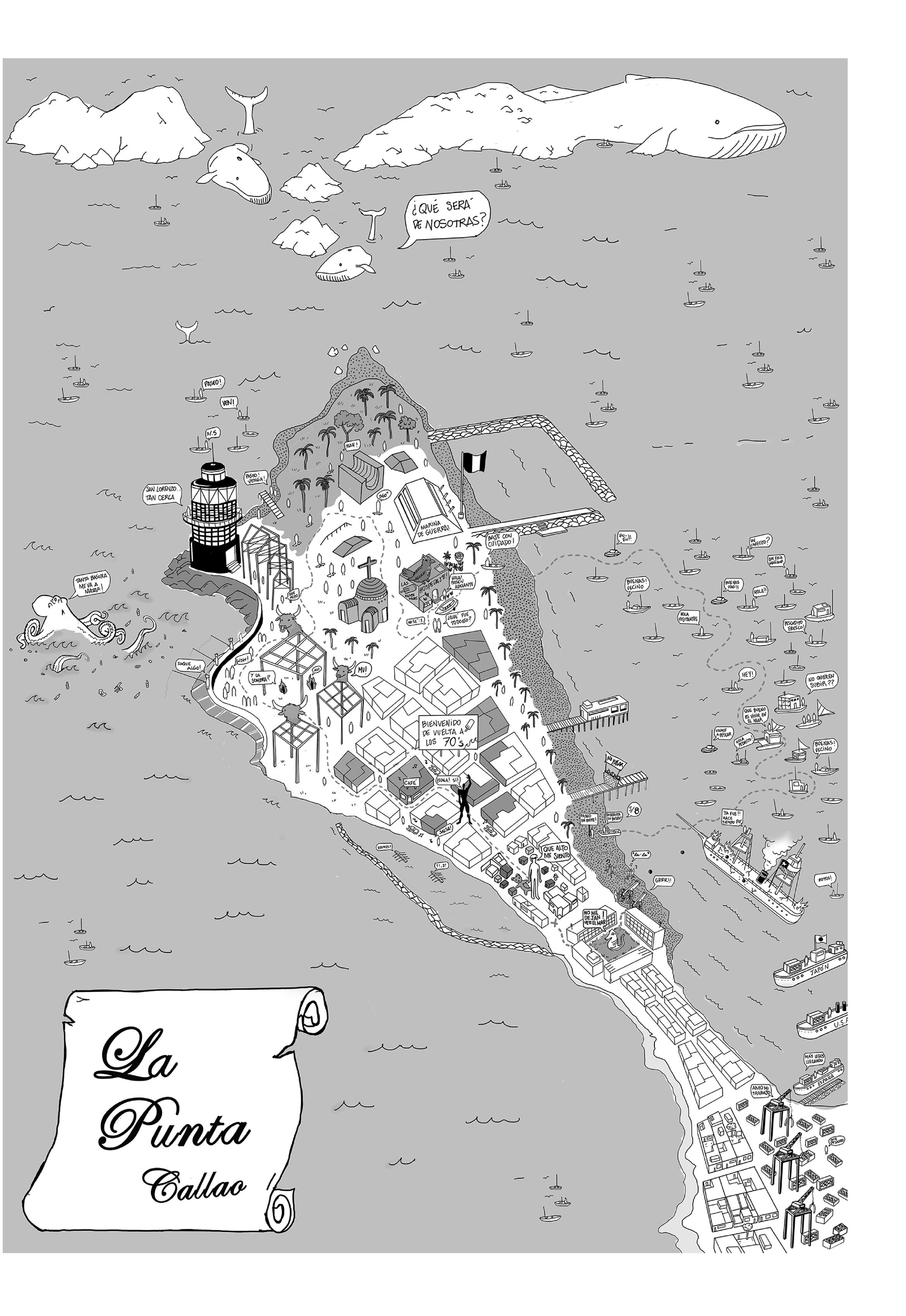 À droite: Carte Psycho-géographique - La Punta, Callao. Illustration réalisée à partir d’une analyse fondée sur le concept de La Dérive théorisé par le mouvement situationniste.