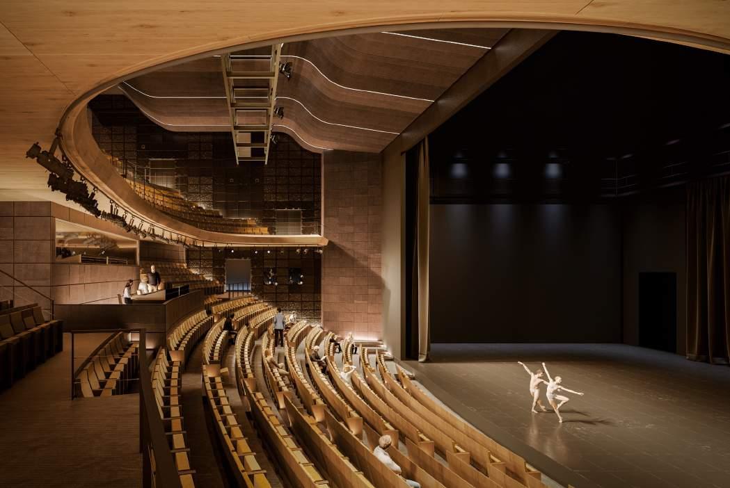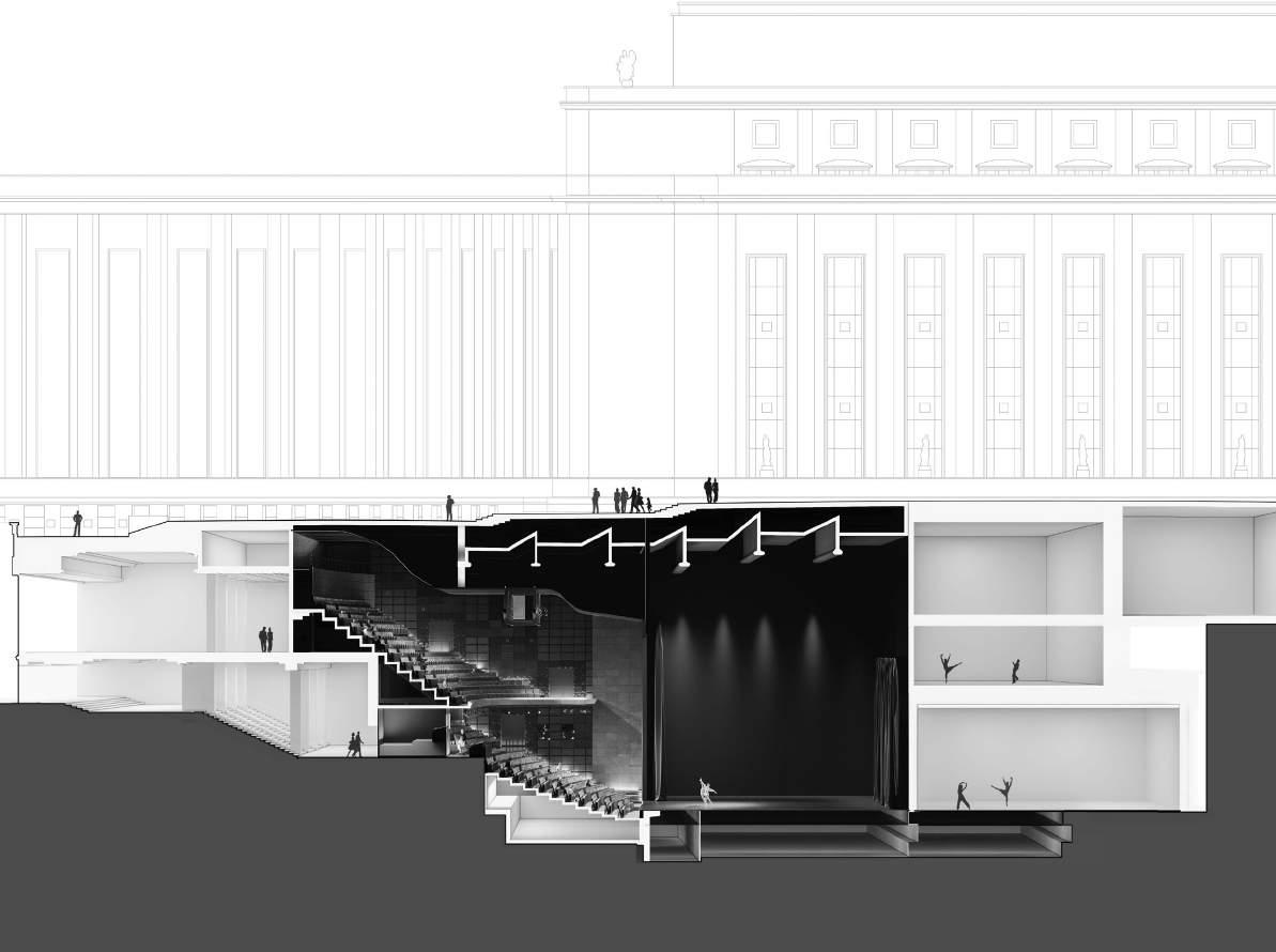 Dans le but de proposer des techniques plus adéquates aux besoins actuels des danseur·s·es, les modifications proposées se concentrent dans la scénographie et le réaménagement de l’espace spectateurs. Avec une démolition ponctuelle de la salle actuelle nous retrouvons le caractère solennel du grand foyer. C’est un projet respectant son héritage et s’adaptant pour son usage futur.