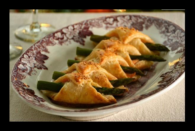 1 lámina rectangular de hojaldre, 175 grs. salmón ahumado, 16 espárragos trigueros gruesos, 50 grs. queso crema, 1 huevo, semillas de sésamo