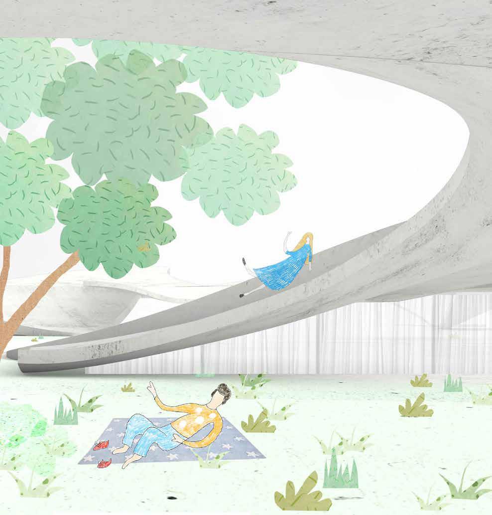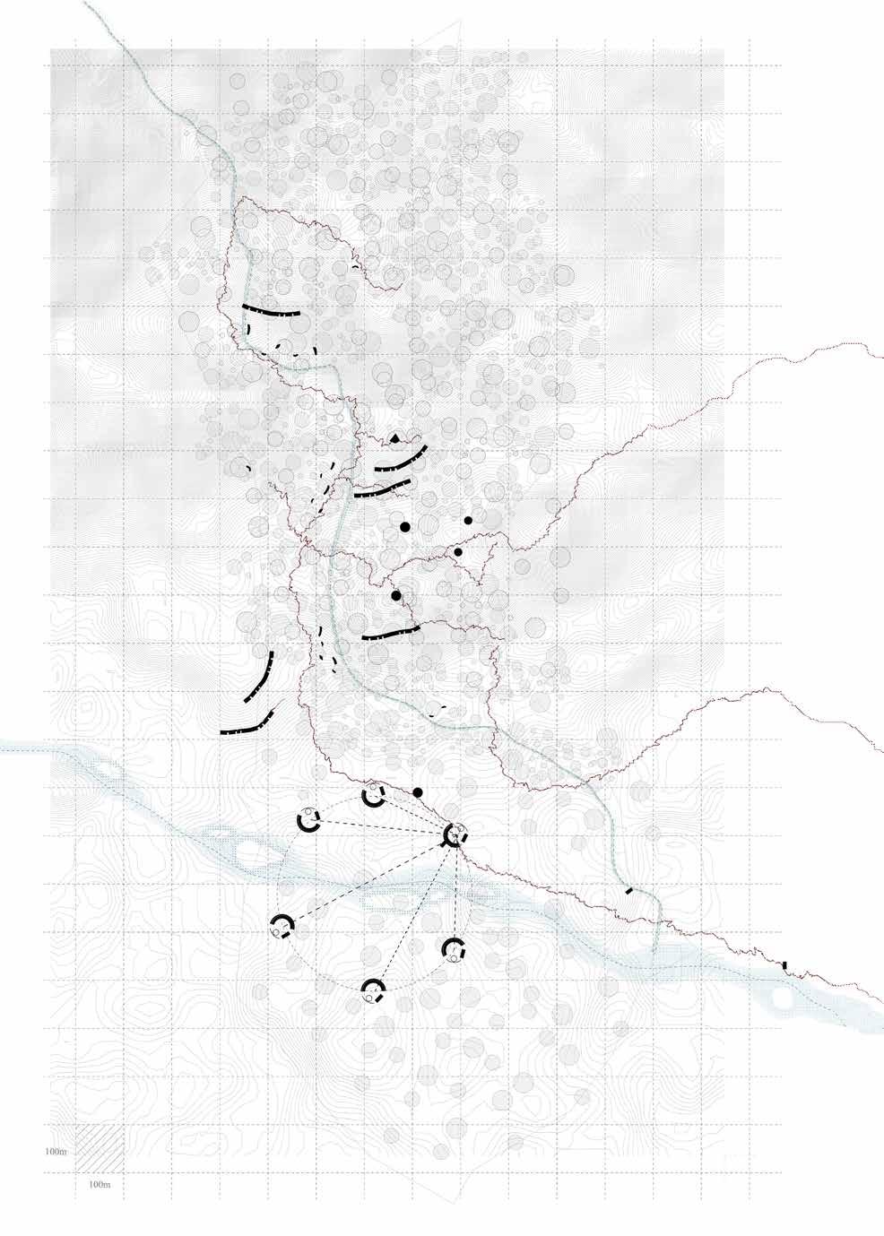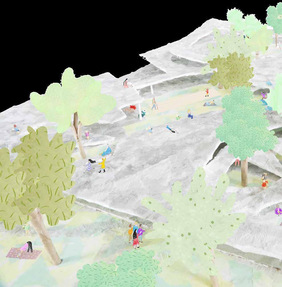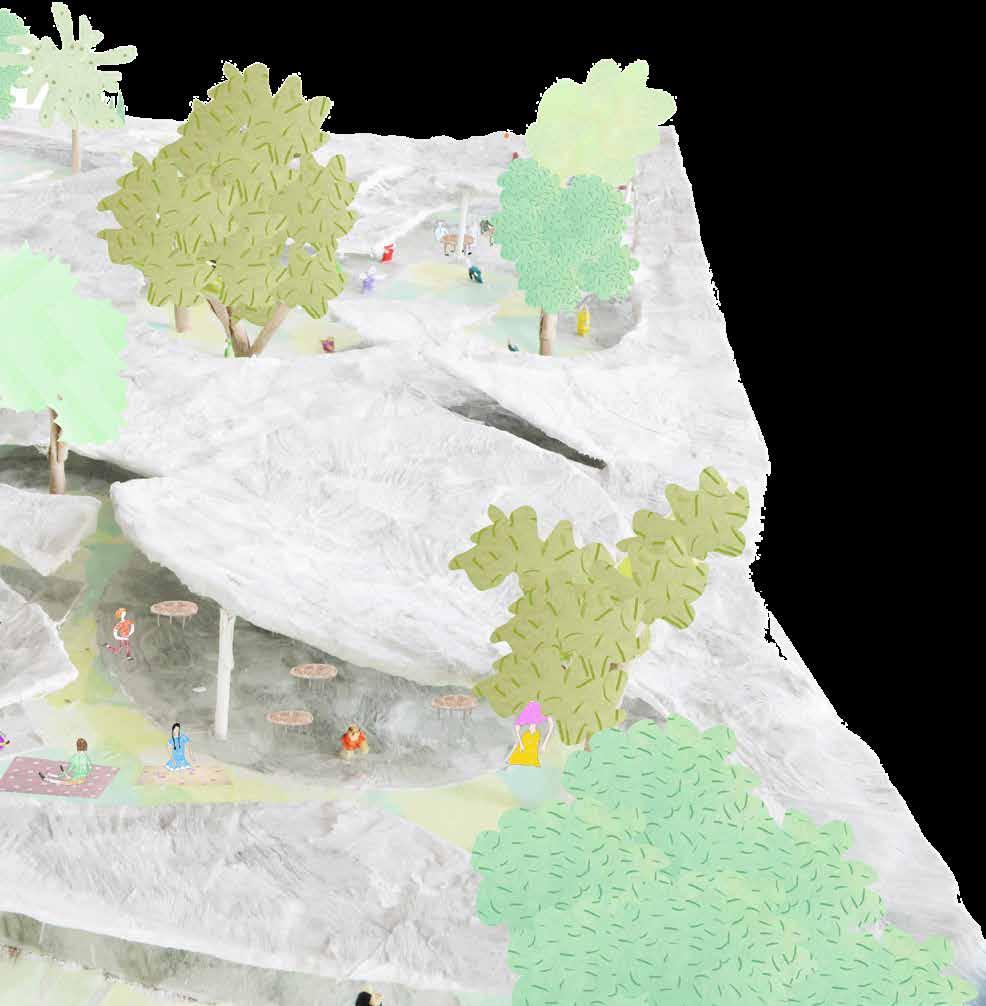 The project aims to enclose a key location for mountain access to the city. In 1953, there once stood a lake until drying up by 2002, and is now occupied by two residential buildings. The intervention seeks to respect this 70 year evolution and include the adaptations as part of the dynamic history and symbiotic relationship between the mountains and city. For example, the residential buildings are preserved, and a body of water is created, paying homage to the lake that once existed there.