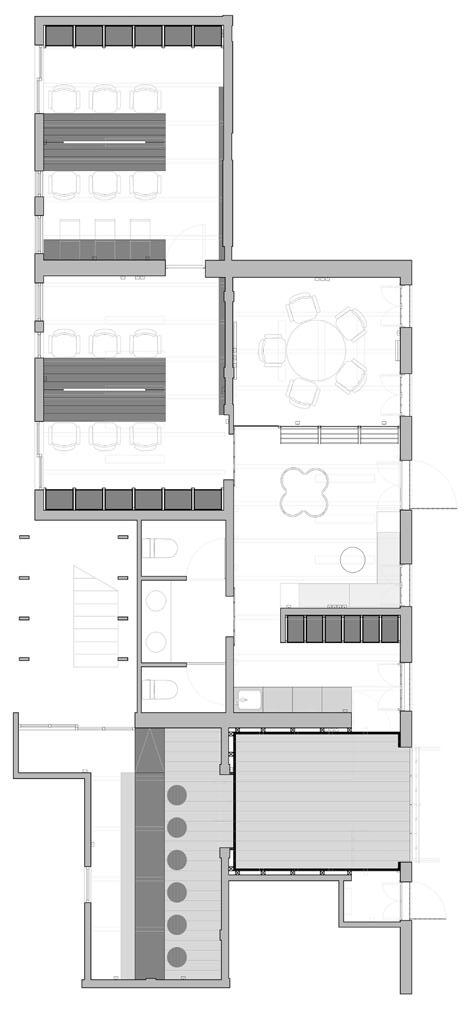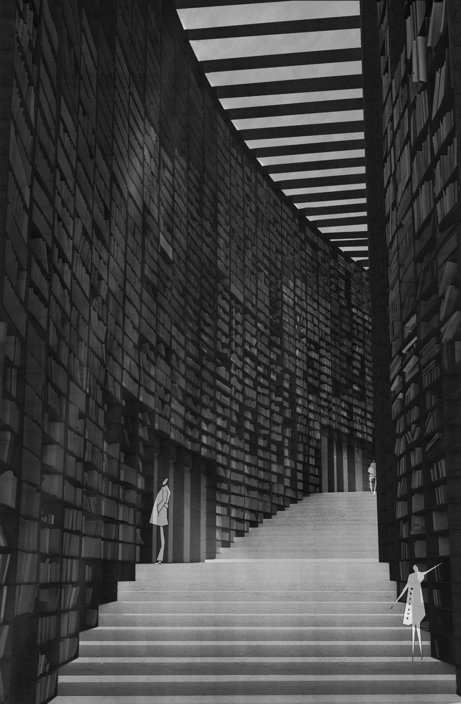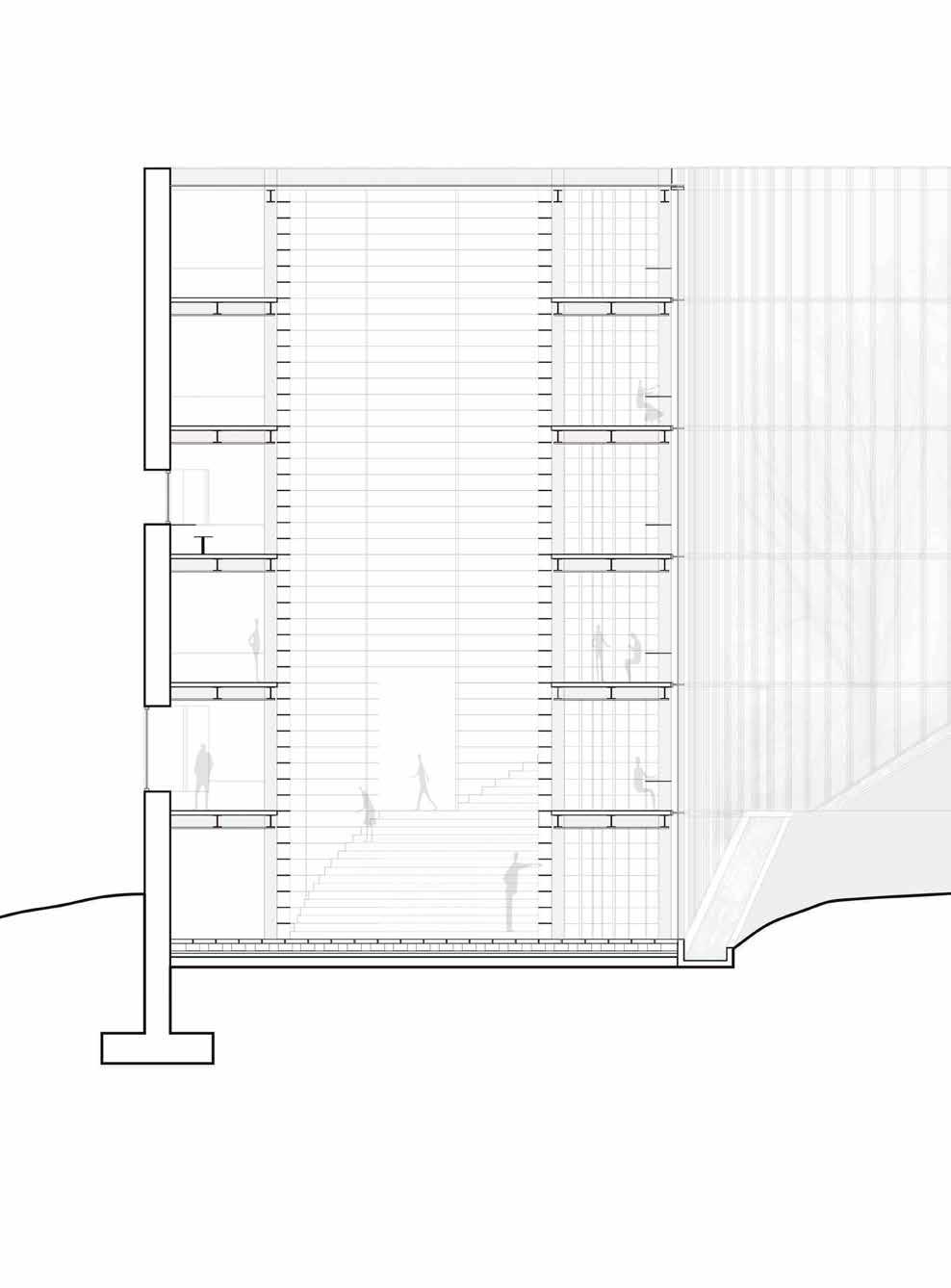 The interior of the building is conceived as the space between facades, the space between the city and the mountain.