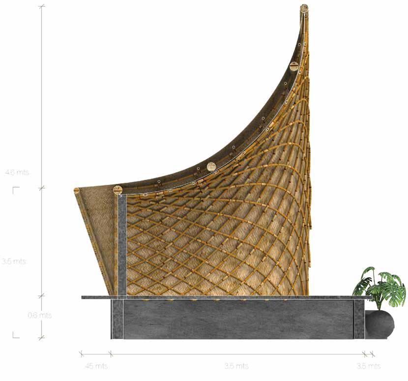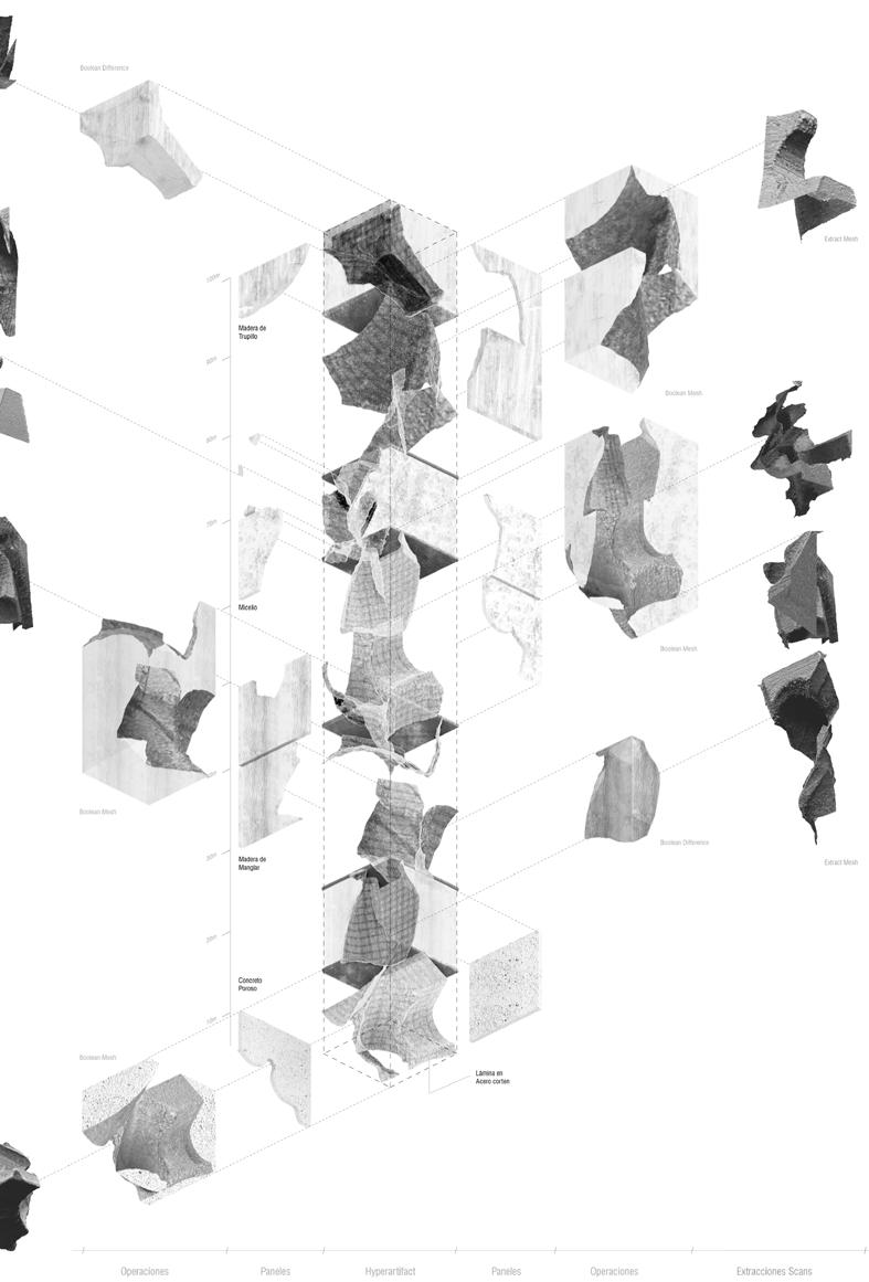 The exposure of the artifact to winds, saline sediments, and rainwater dictates the beginning of a decomposition process. The inner piece starts to reveal itself as the panels begin to fall. The panels transform into ruins, and the ruins metamorphose into mangroves. Composed of “trupillo” wood fibers, mycelium, mangrove trunk, and porous concrete, they harbor life whether standing or fallen. Upon touching the ground, they disintegrate into minerals that catalyze the mangrove that once was, now ready to be reborn.