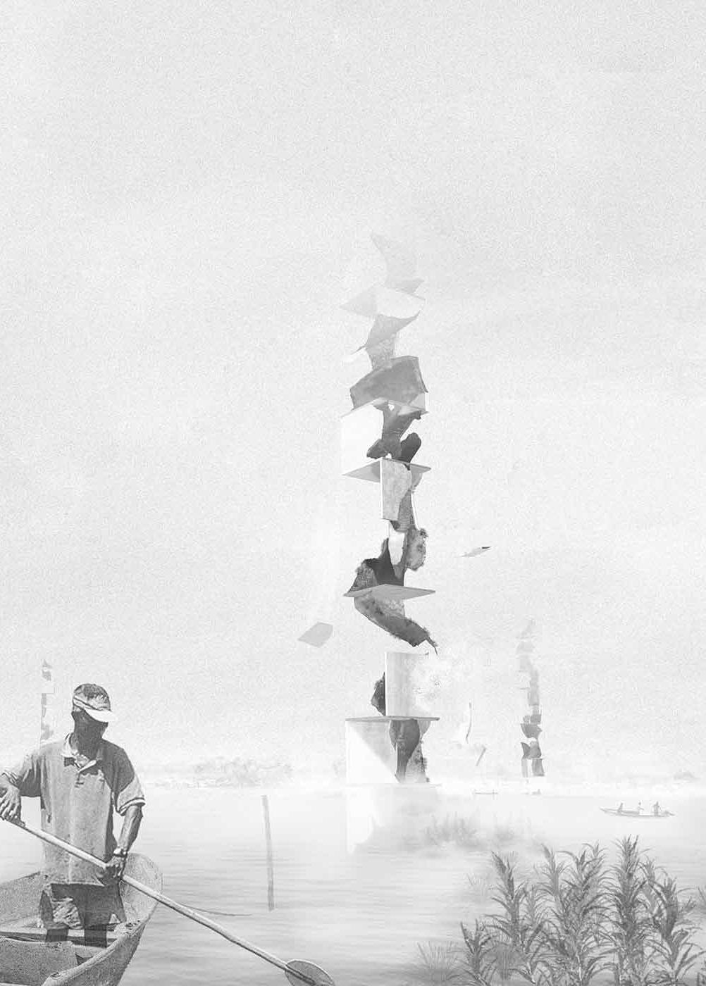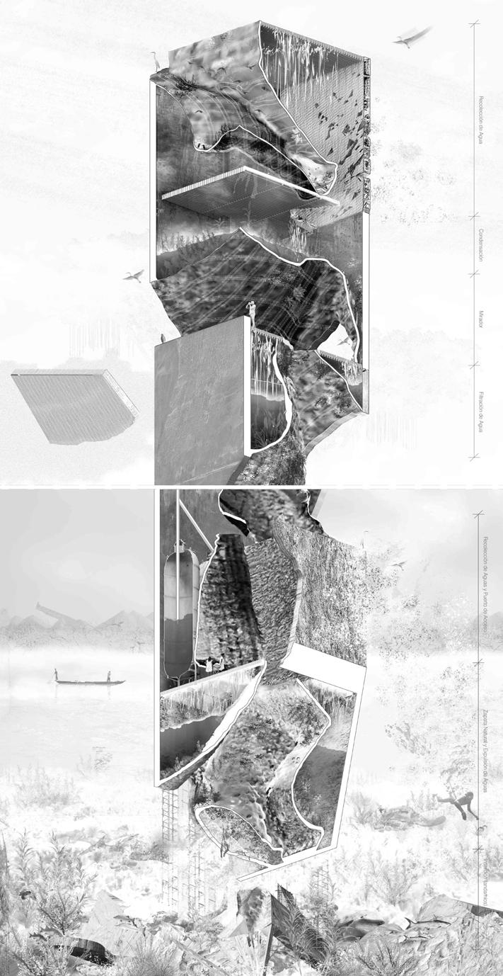 carved with the highest precision, giving life to fungal, aeroponic, and hydroponic microorganisms. The piece, functioning as an artifact, decomposes to compose the landscape, a pretext for contemplating ecosystemic processes. The hyper-artifact captures water from its most ephemeral state: vapor. It condenses into vertical reservoirs that progressively filter water through sinuous cavities and linear pipes, providing a direct potable resource for the Musichi fishermen.