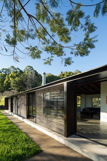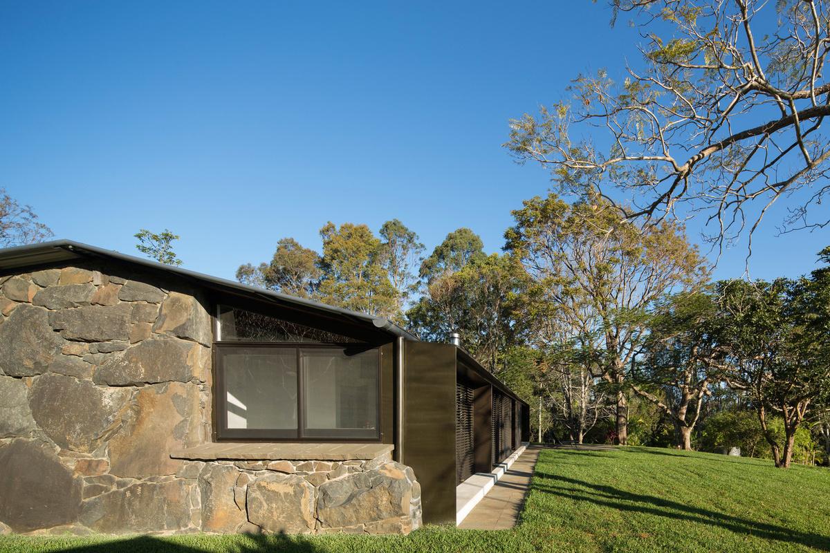 Utiliza el muro de piedra canteada para darle mayor resistencia y estabilidad a la casa y así a la vez dando un contraste con el lugar.