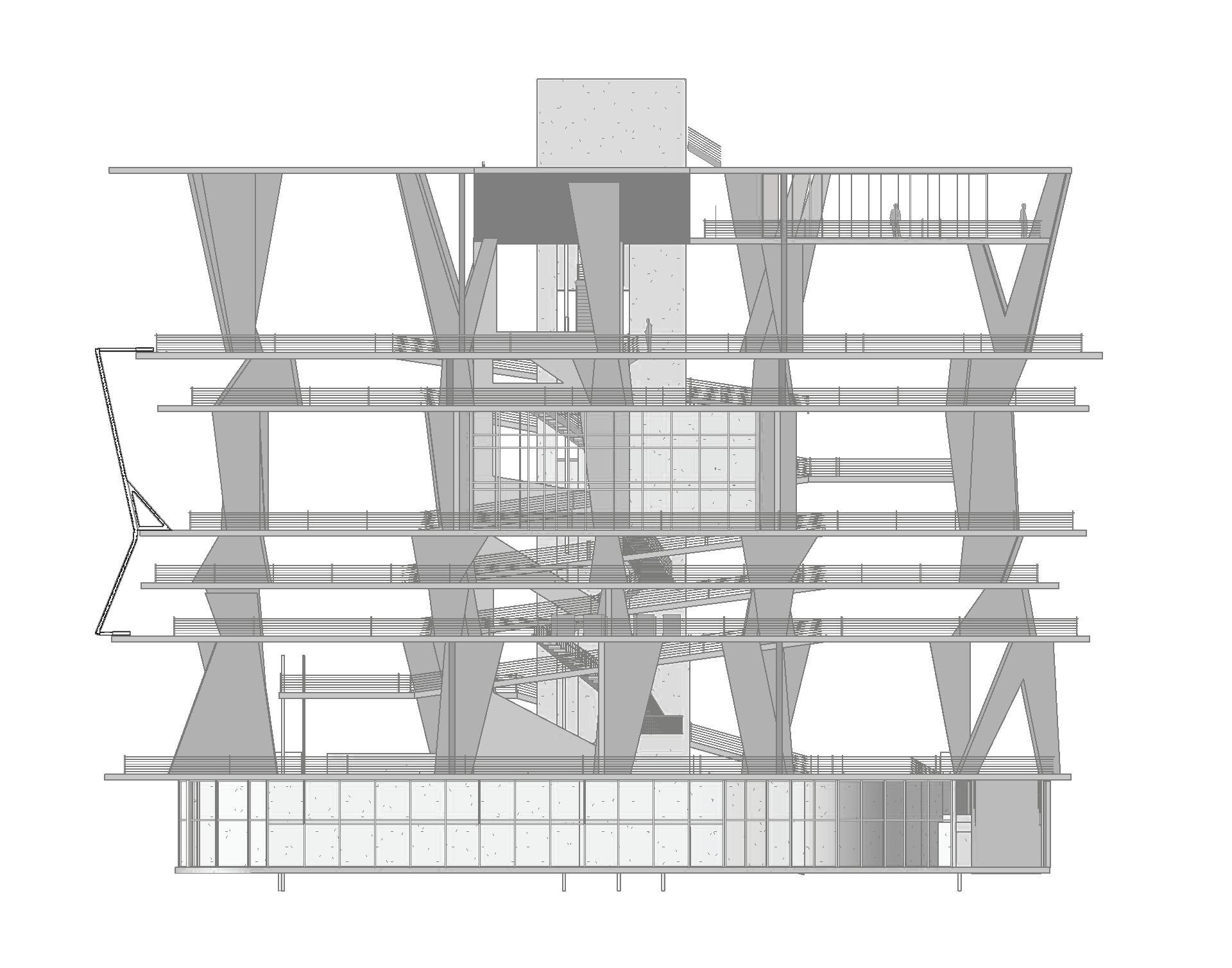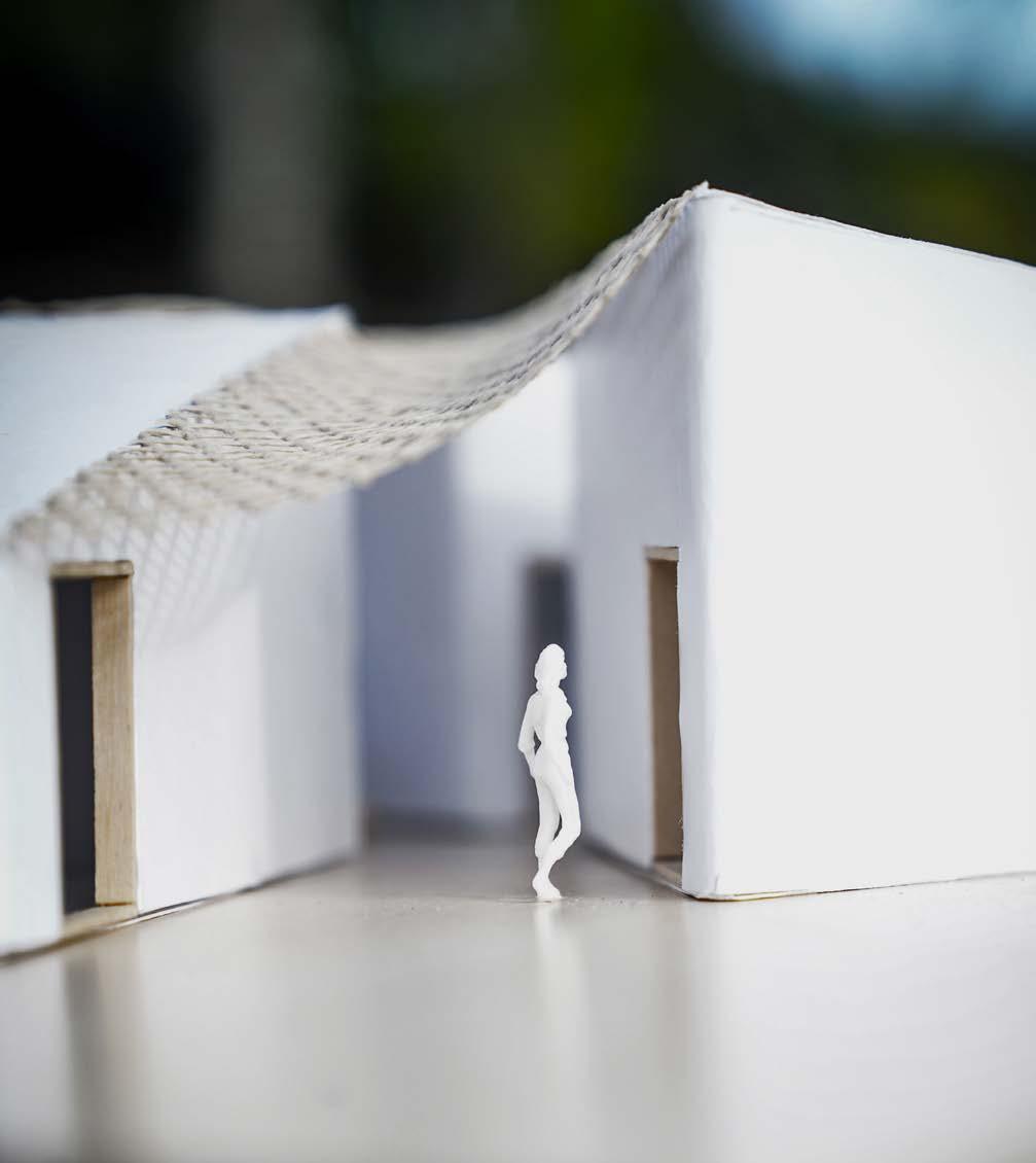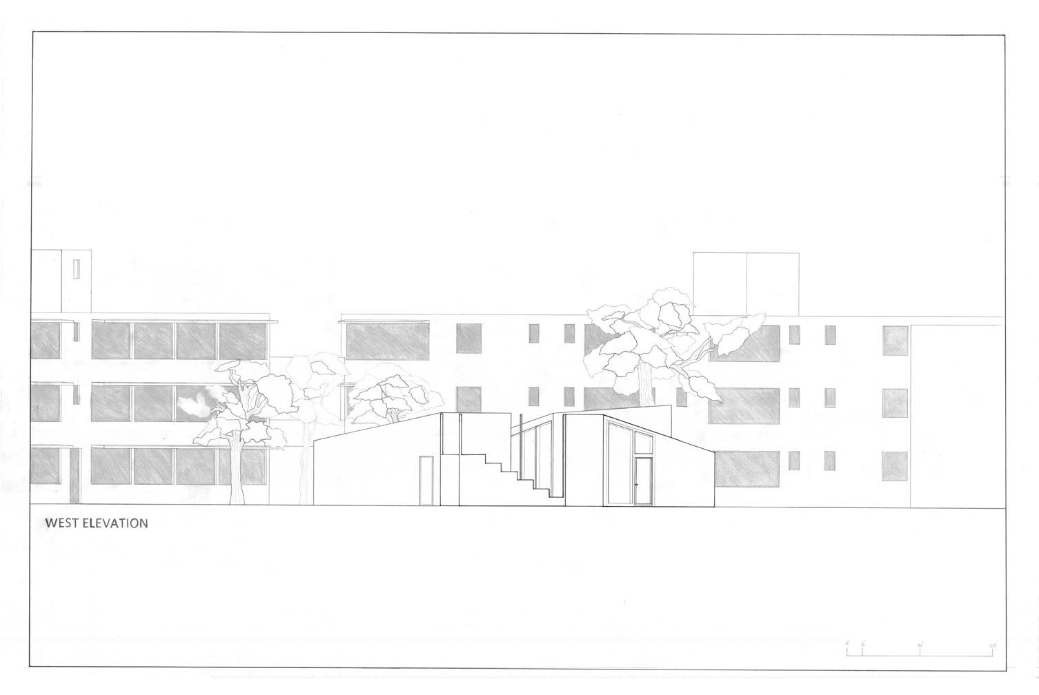 Commissioned to create a gallery space where humans would feel the concept of compressed space, I decided to carry on the sentiment by creating a tight outdoor circulation between the three main inddor spaces. Dividing the gallery spaces and the supporting bathrooms and storage space, the walkway leads up to the exterior covered bench bleacher style seating facing a projection wall that would display projects or films. The exterior seating doubles as a pin up location that takes advantage of the natural light that surpasses the oak trees and the hatched fabric. the separation of both gallery spaces allows for demonstration of multiple exhibitions. the four circulation openings all lead to different destinations; lake osceola to the North, the SOA courtyard to the east, the administration building to the south, and hecht to the west.