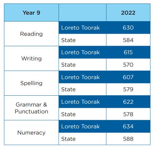 In 2022 we were once again pleased and impressed with the overall results for NAPLAN, especially given the fact this was the first year these tests were undertaken online. The accompanying tables highlight how Loreto Toorak compared with the state mean in each of the domains: reading, writing, spelling, grammar and punctuation and numeracy.