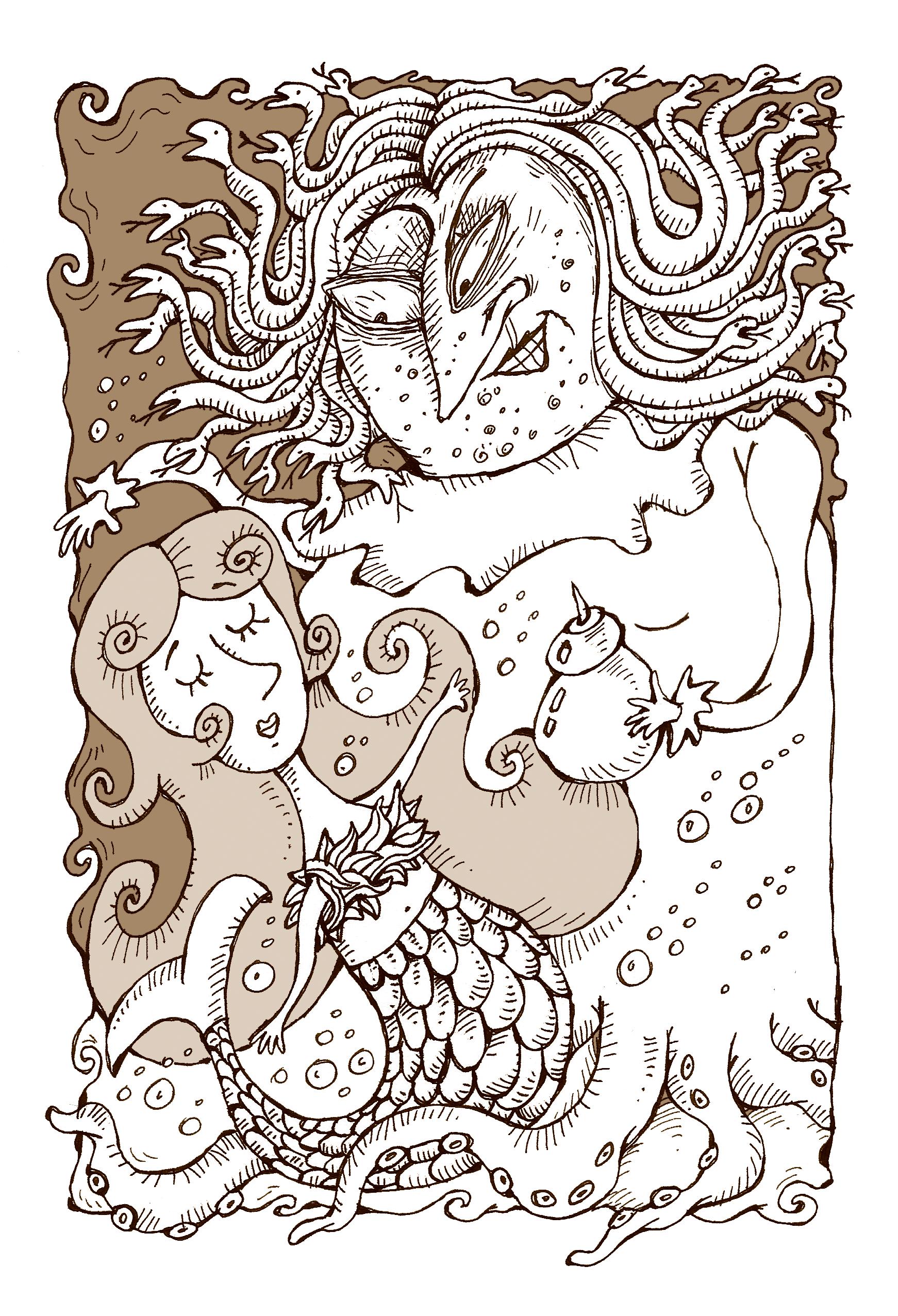 En alta mar el agua es transparente como el cristal más puro. Al igual que sus hermanas, que también eran sirenas, no tenía piernas: su cuerpo terminaba en una plateada cola de pez. Los cabellos de la Hechicera se agitaban en el agua como miles de serpientes.