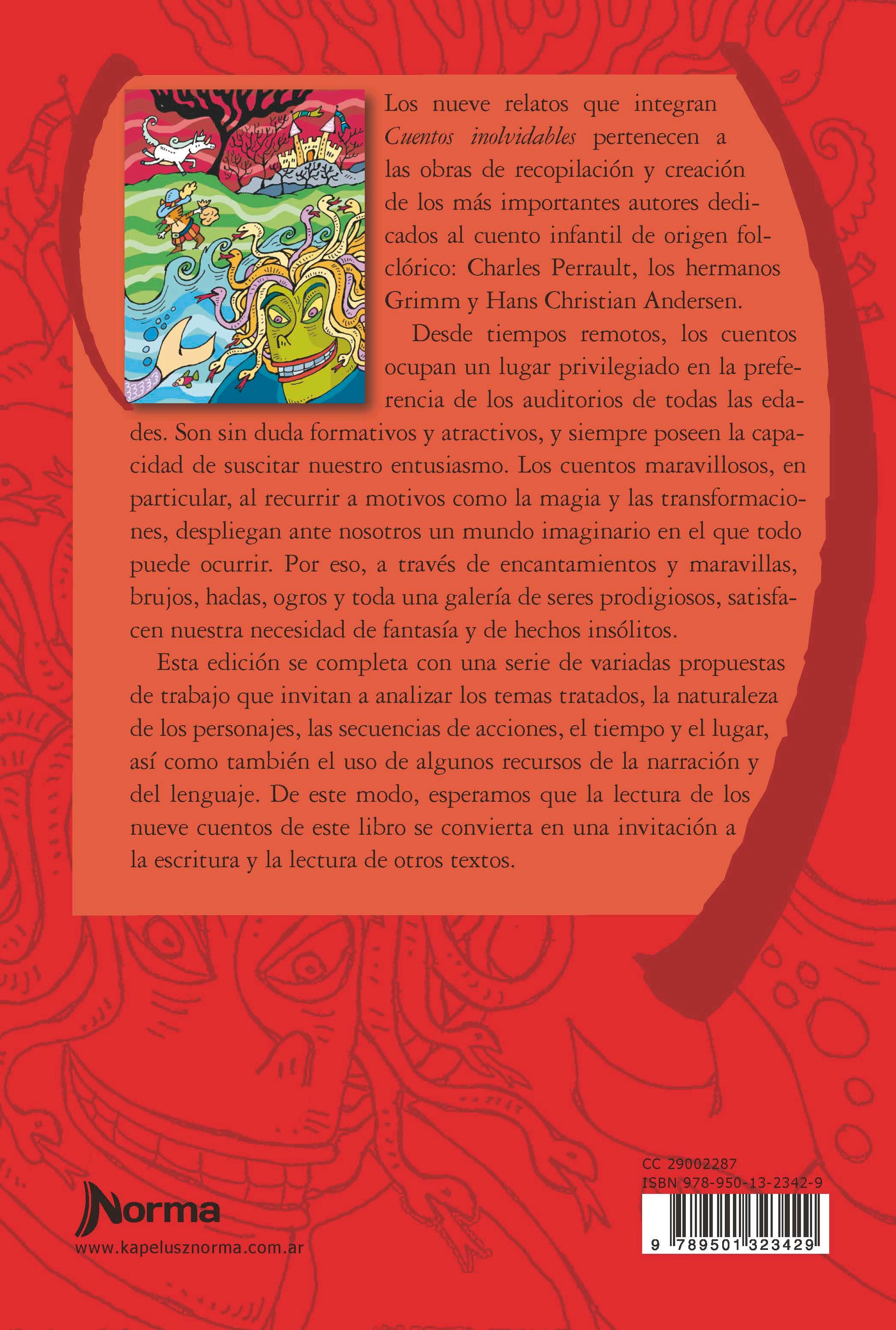 Los nueve relatos que integran Cuentos inolvidables pertenecen a las obras de recopilación y creación de algunos de los más importantes autores dedicados al cuento infantil de origen folclórico: Charles Perrault, los hermanos Grimm y Hans Christian Andersen. Entre los diferentes tipos de textos que circulan en la escuela con el objetivo de que seamos capaces de apreciarlos y comprenderlos, reconocer el modo en que funcionan, disfrutarlos y —por qué no— producirlos, los cuentos ocupan un lugar privilegiado. Son sin duda formativos y atractivos, y siempre poseen la capacidad de suscitar nuestro entusiasmo.
