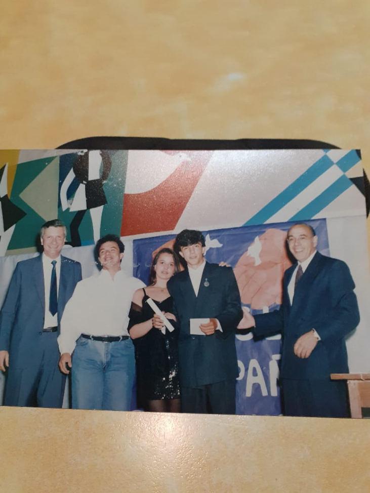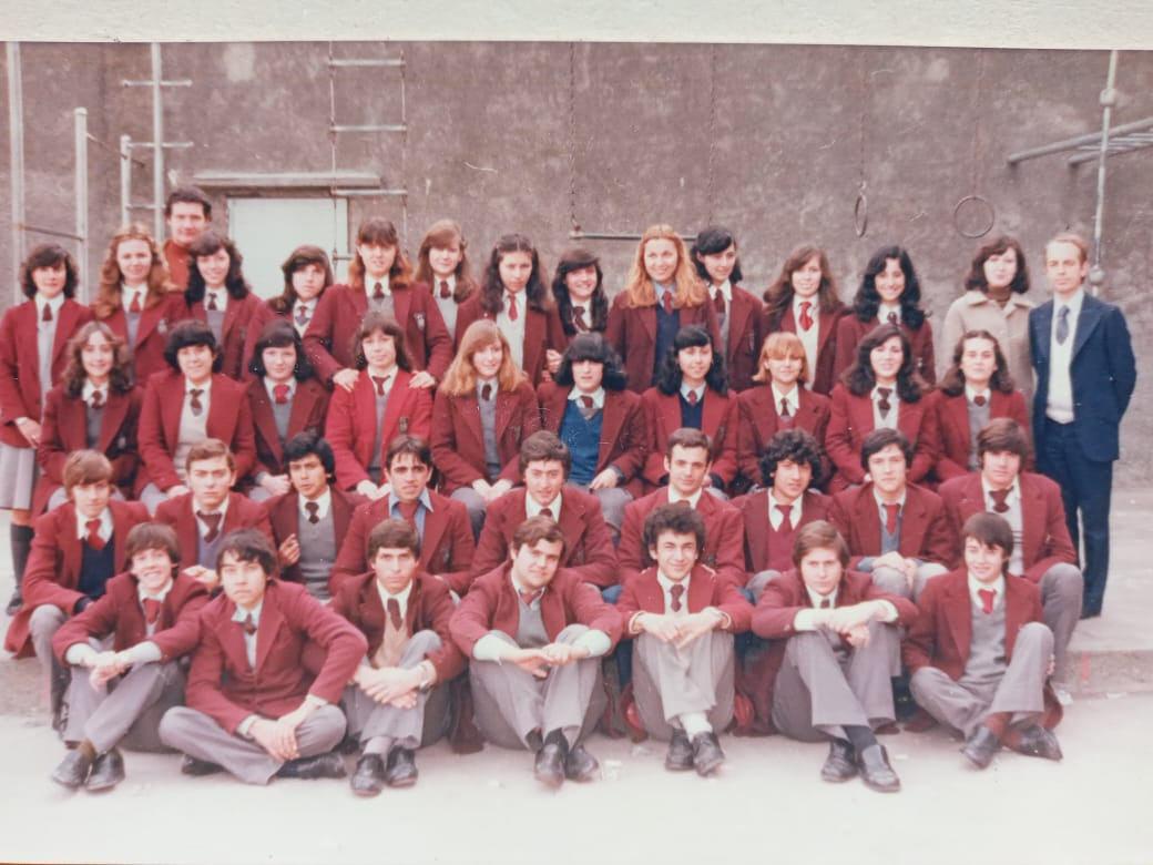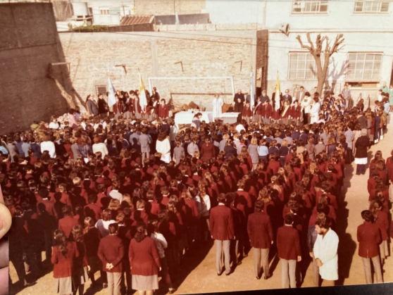 En la foto grupal que les comparto, podrán ver alumnos de primer y segundo año. La foto fue tomada en la escuela primaria. La escuela funcionaba en los salones de la parroquia, los que hoy se encuentran detrás del templo. La directora del nivel, era la directora del secundario de manera provisoria siendo que estaba en crecimiento y no se había designado rector aún. En el centro, se puede ver a Carlos Romagnoli, quien era profesor de mecanografía, pero también cumplía otras funciones en la escuela, como profesor de educación física, preceptor, entre otros. Luego fue designado rector transitorio. El Padre Gareli también participa de esa foto, quien era sacerdote de la parroquia. La foto individual fue tomada en mi casa, cuando cursaba primer año. Recuerdo que cuando llegábamos a la escuela, nos sacábamos el blazer y nos poníamos un guardapolvo gris oscuro, que después volvíamos a colgar en los percheros del aula, para salir a nuestras casas con el blazer. Terminado mi secundario, me alejé unos años producto de mis estudios universitarios, para luego volver ya como representante legal de la institución. Gran parte de mi vida está felizmente en estas paredes.