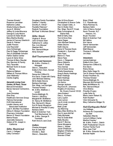 Theresa Kinealy* Rozanne Lancaster Katherine Lottes Sheila Ardoyno Maurin Joyce E. Minkler* Jeffrey & Linda Misuraca George & Judy Moore Leonard & Helen Mudd Mary Martha Mueller James & Frances Oberkirch Sarah A. Palmer* Judith Powers Lisa Reynolds* June Schlesinger Paul & Peggy Schlesinger Terry & Elizabeth Schoeni Father Seelos Center Laura & Gene Sinex Thomas & Mary Stauder Ray Stevison & Family Tony Taravella Michael Tevlin & Susan Murray Rebecca Watson William & Thomas Wilcox Joan Wislinsky* Cecilia Zoghby Nazareth Living Care Center, El Paso, Texas Manuel Armendariz Banes General Contractors, Inc. José Gonzalez Elsa Gray Healthcare Services Group Patricia Hernandez HUB International Loretto Literary and Benevolent Institution Lula H. McAfee Foundation Wilma D. Moleen Foundation Pharmacy Unlimited Marion G. Resch Foundation Belma Rosas Jeannette Sessums Sisters of St. Joseph in California
