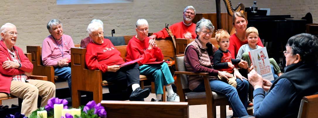 Loretto Motherhouse hosted a Christmas open house and invited the local community, with more than 300 neighbors and friends attending. It was a wonderful celebration of the season, topping off an eventful year at the Motherhouse. Here, Sue Rogers SL, far right, reads a story to gathered Loretto Community members and friends in the Motherhouse church. Also on offer were caroling, cookie decorating, a scavenger hunt and photos with Santa Photo: Will Myers