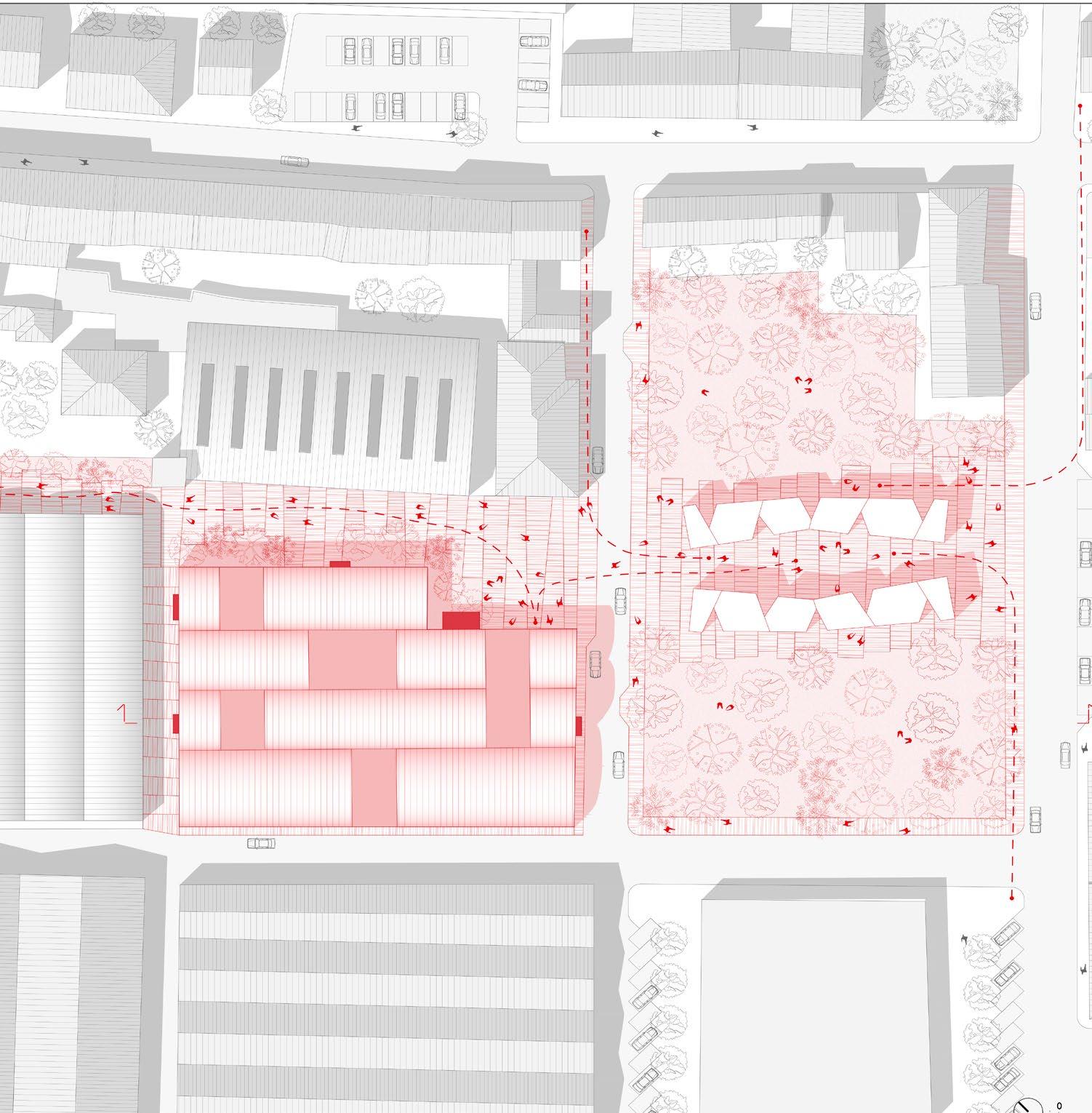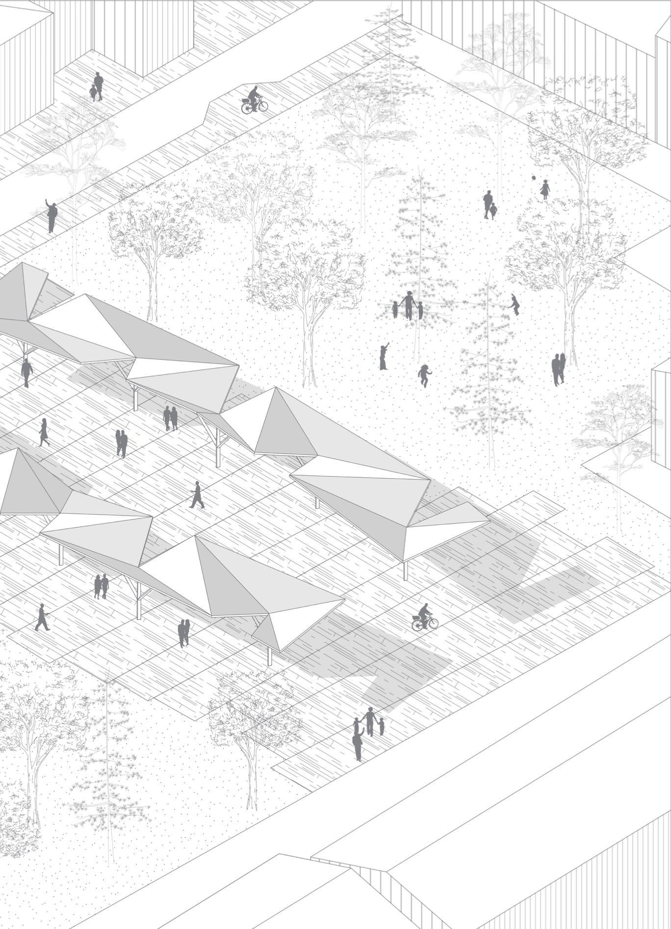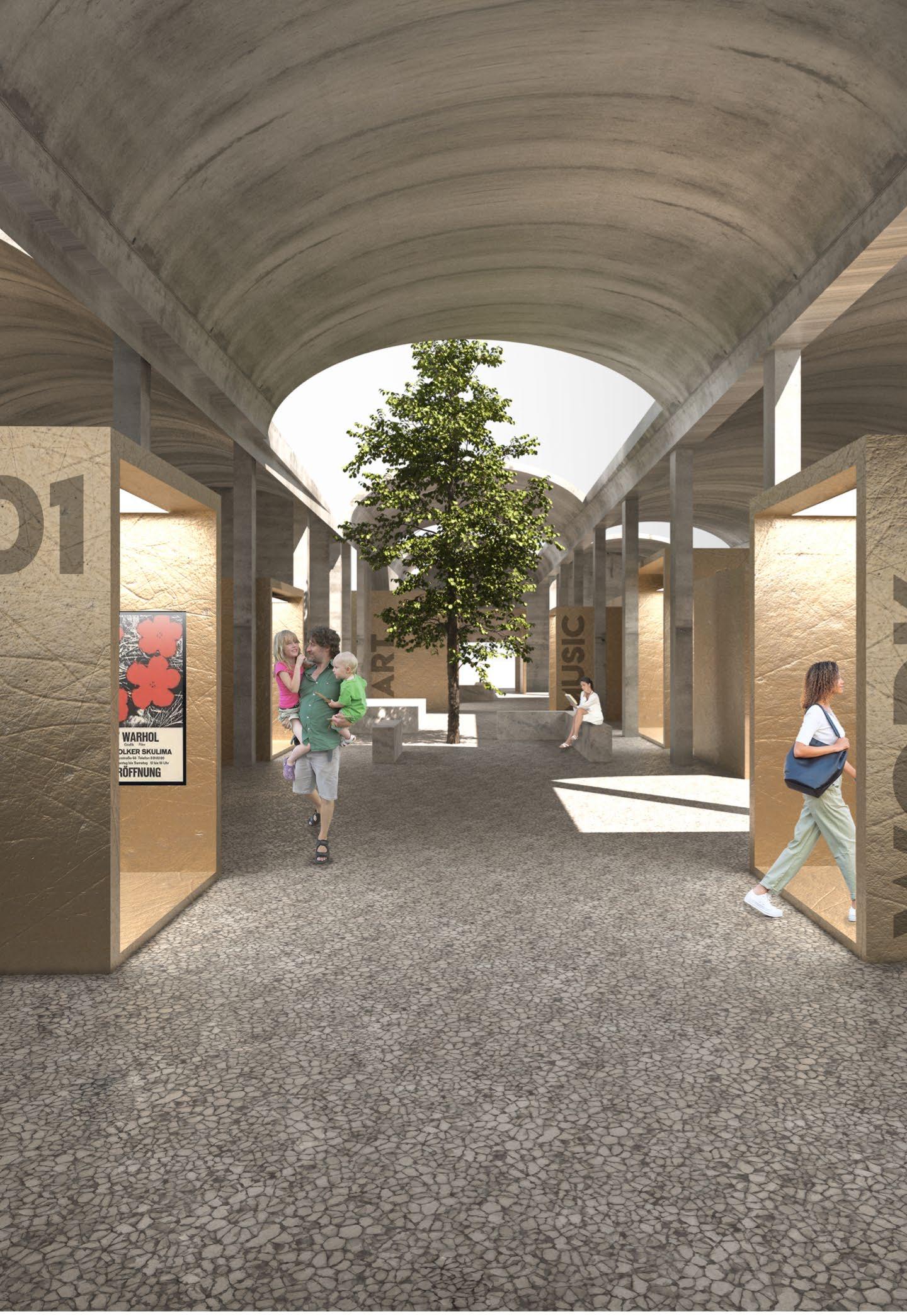 L’intervento finale del progetto è stato incentrato sulla riqualificazione urbana di un capannone industriale a tre navate. La proposta prevede la trasformazione di questo spazio in aree di co-working e spazi espositivi per artisti. In aggiunta, è stata progettata una nuova piazza