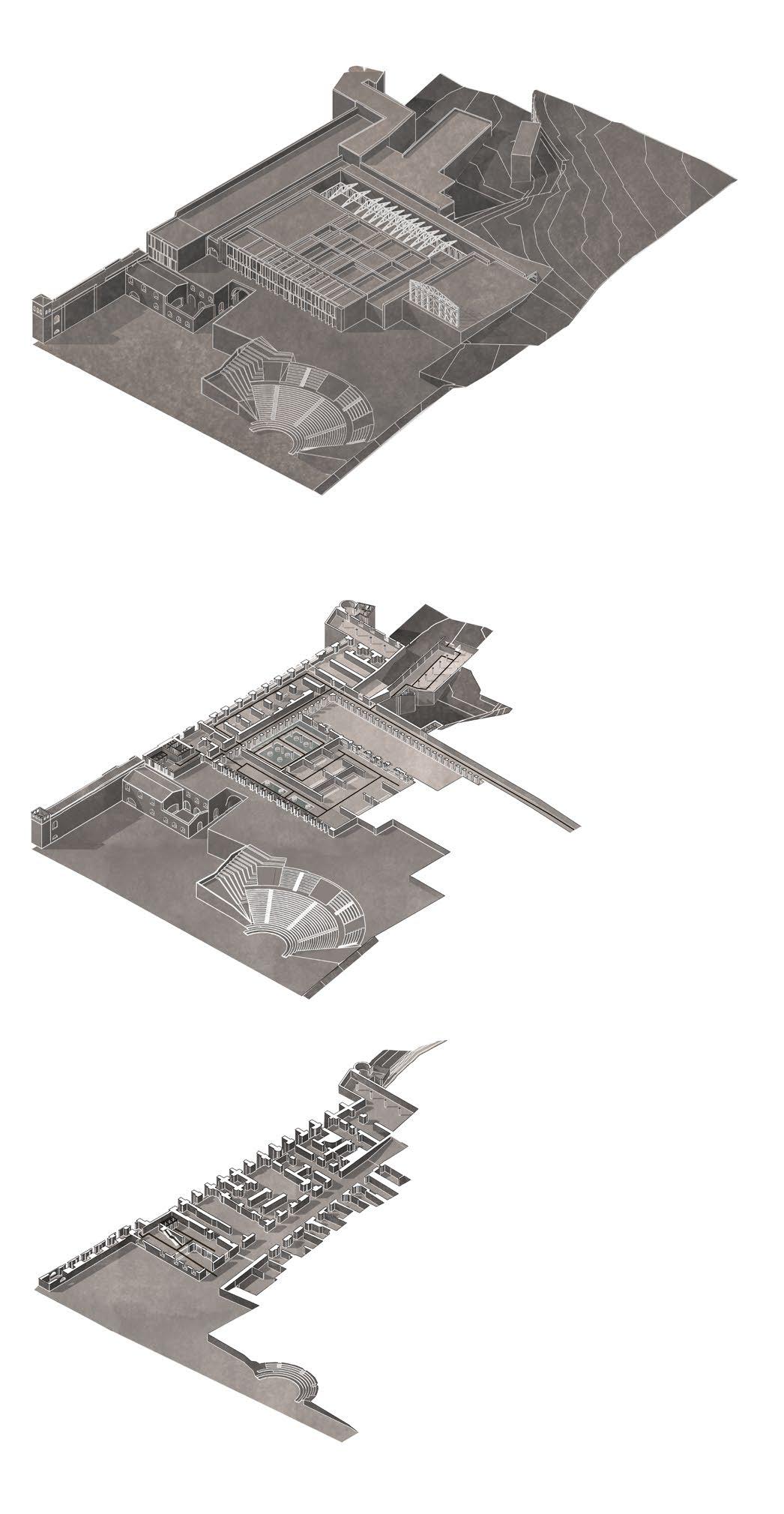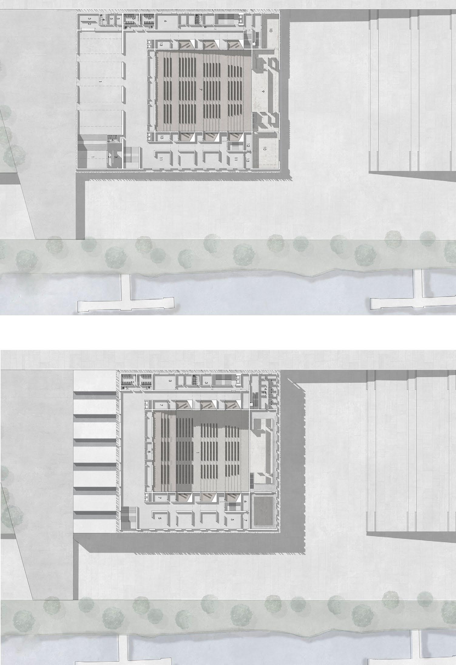di aprirsi su quest’ultima. Vengono proposte delle promenade parallele al fiume su due livelli distinti collegate da una scalinata usufruibile come “graderia” o semplice elemento di collegamento. Dal punto di vista compositivo al volume vengono aggiunti elementi schermanti di varia dimensione e altezza con lo scopo di rompere un modulo o una simmetria”, volontà che viene riproposta anche in pianta in corrispondenza della sala dove la copertura viene frammentata e abbassata in relazione alla pendenza di quest’ultima.