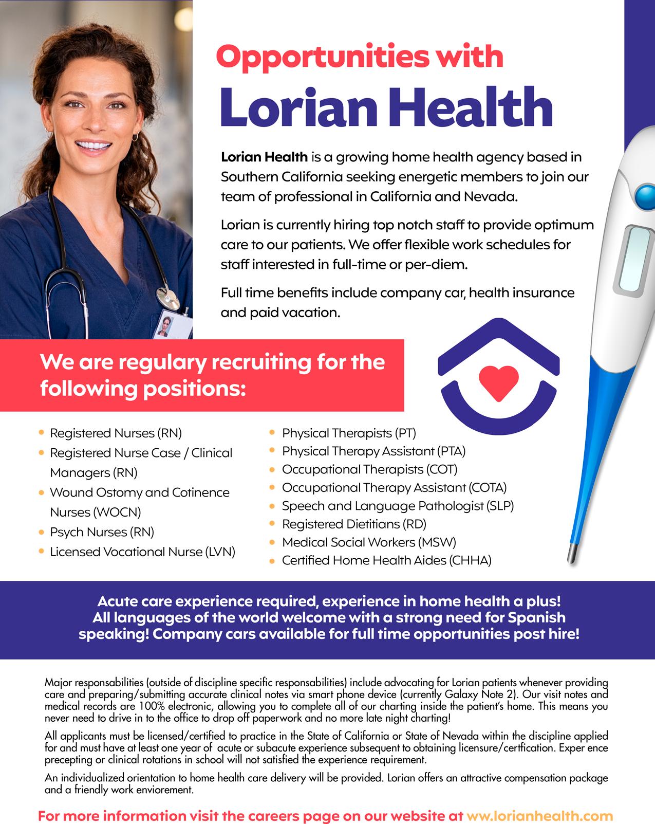 ii Enhancing the Quality of Life at Home TM TOLL FREE : 1-877-LORIAN-5 (1-877-567-4265) www.lorianhealth.com A MEDICARE-CERTIFIED HOME HEALTH AGENCY Serving California and Nevada