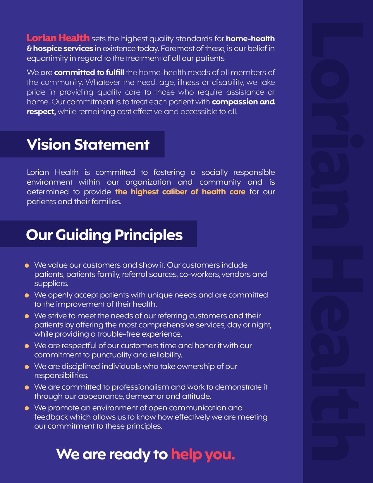 These rights will be respected by all of Lorian Health’s (Lorian) personnel and integrated into all Home Health programs. A copy of these rights shall be given upon the commencement of services to the patient or to the patient’s family, guardian, or authorized representative when the patient has been judged to be incompetent.