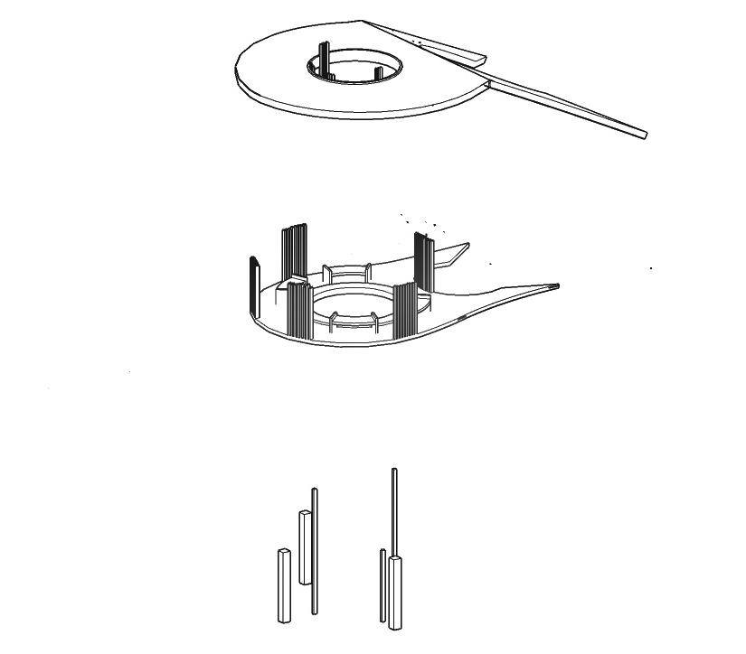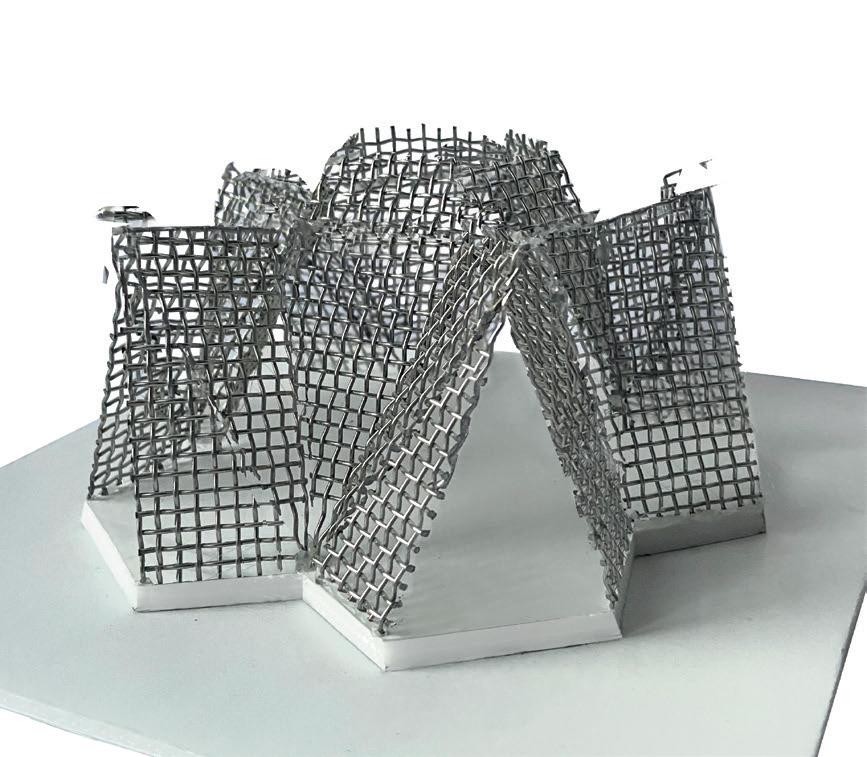 Pour cette seconde proposition, j’ai réalisé une maquette de principe à l’echelle 1/50. J’ai pour cela utilisé des feuilles de grillage en maille fine que j’ai découpé à l’aide d’une scie circulaire, avant de les assembler à l’aide de colle. Ce travail minutieux rend ainsi bien compte de la légèreté et la transparence de la structure.