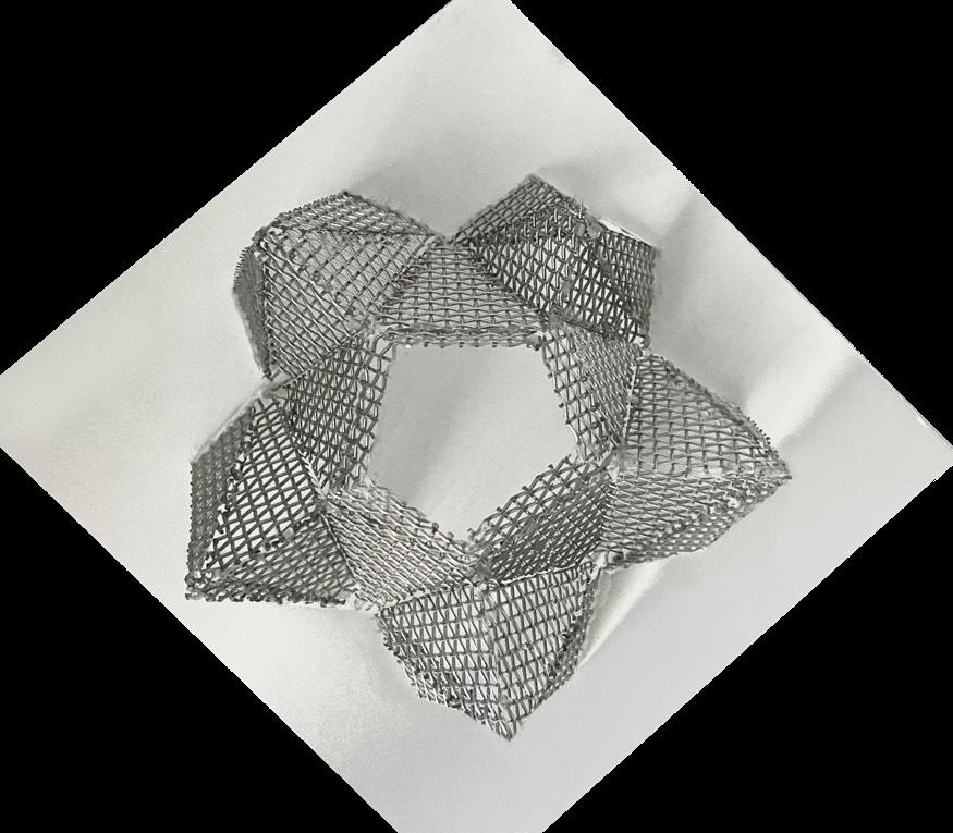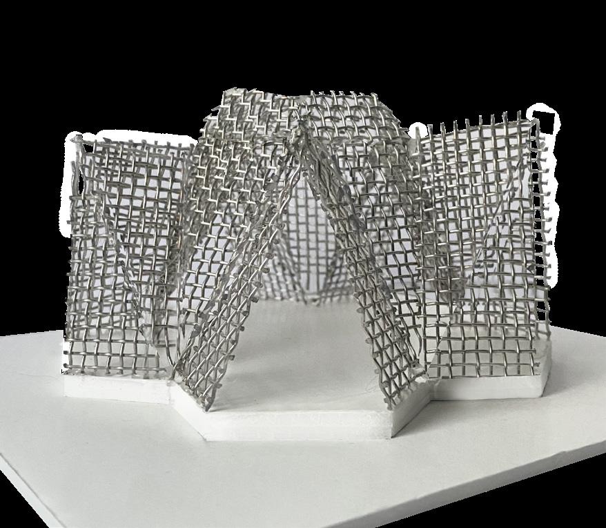 Pour cette seconde proposition, j’ai réalisé une maquette de principe à l’echelle 1/50. J’ai pour cela utilisé des feuilles de grillage en maille fine que j’ai découpé à l’aide d’une scie circulaire, avant de les assembler à l’aide de colle. Ce travail minutieux rend ainsi bien compte de la légèreté et la transparence de la structure.