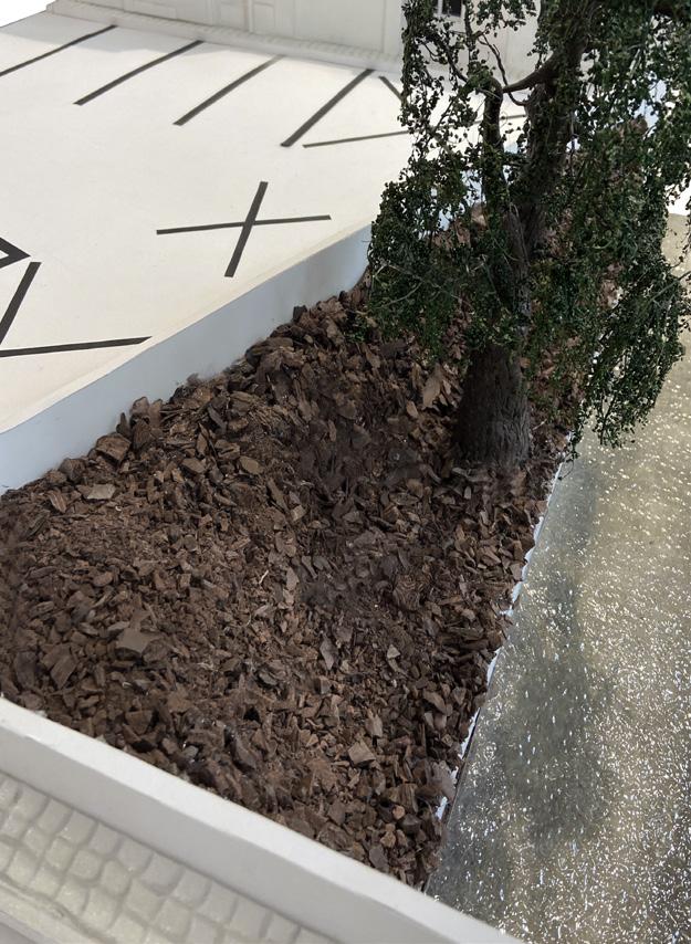 Comme première proposition, nous avons alors imaginé une structure en liège de forme organique qui rappelerait de façon subtile le caractère saccadé des rails et détails métalliques de la gare.