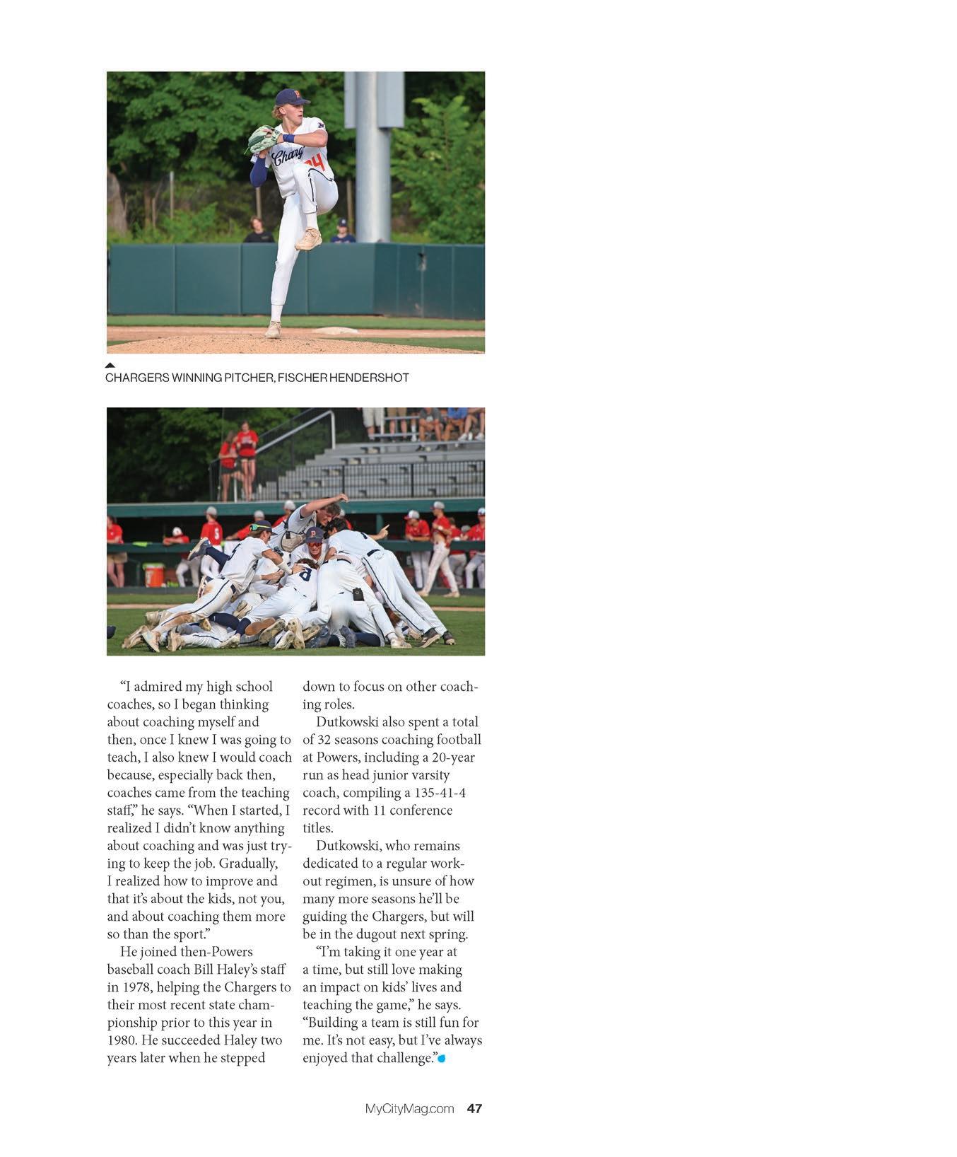 Speaking of sports, we’re so happy for the opportunity to applaud and highlight the fantastic Powers Catholic High School Chargers Baseball Team – 2024 Division 2 State Champions! Coach Tom Dutkowski and others o ered their thoughts about earning that trophy starting on pg. 42.