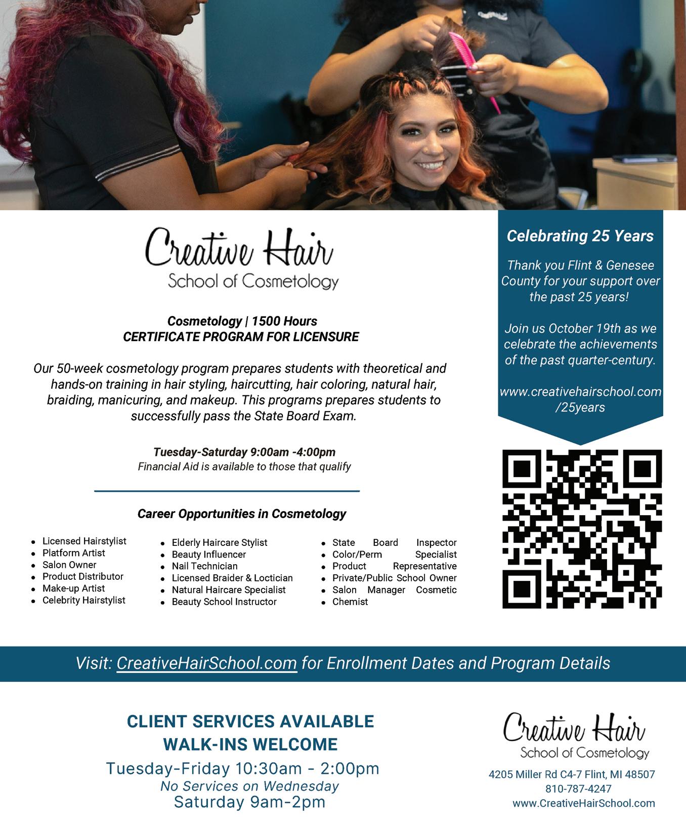 It’s nearly upon us … back-to-school season! Education and its crucial role in our society has been a subject of much discussion for many years. I feel that Greater Flint is home to many excellent educational opportunities for those seeking to learn on every level. In this “Education” issue, we highlight programs o ered at the Flint Institute of Arts, Kettering University and the Genesee Career Institute. And, I know you’ll be surprised by the myriad of educational programs available at the Genesee District Libraries – and we o er just a sample! (See pg.16.) In addition, we welcome newly-seated UM-Flint Chancellor Laurence Alexander in our “7 Questions” feature this month; I look forward to meeting him.