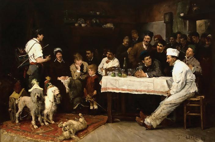 FRITZ VON UHDE, AMERICAN, 1848-1911. THE PERFORMING DOGS, 1880. OIL ON CANVAS. 59 × 89 ½ IN. MUSEUM PURCHASE WITH FUNDS DONATED BY MR. WILLIAM S. WHITE 2011.325