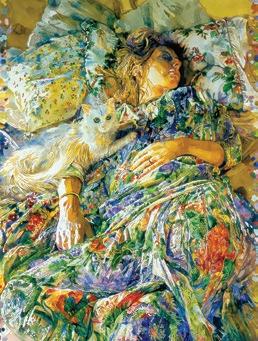 Joseph Raffael’s Le Printemps I is a great example of the cat and human relationship. In the watercolor painting, Raffael’s wife sleeps while their white cat lays on her. If you have a cat, it is an all too familiar scene.