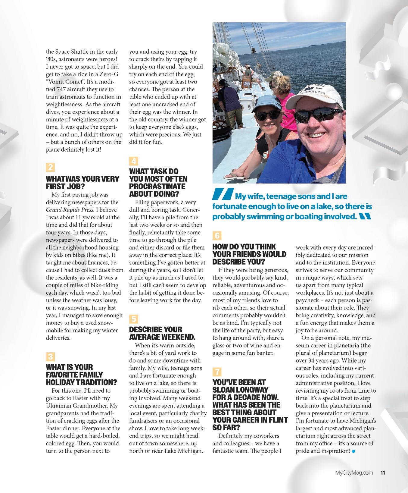 is issue also pro les another notable community leader: Todd Slisher, Executive Director of Sloan Longway. Over the past decade, Todd has merged his passion for science, education and community engagement to transform the visitor experience at the Sloan Museum of Discovery and Longway Planetarium. Learn more about him in our “7 Questions” feature on pg. 10.